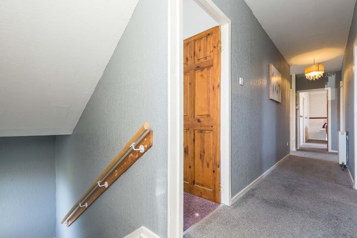 A desirable cul-de-sac setting with a green to the front, and a particularly large communal garden to the rear with a local golf course beyond. The entrance offers space for outerwear, whilst a side aspect south-facing window provides additional natural light from the top for the carpeted stairway. The hall then gives access to all rooms except the kitchen and features two built-in storage cupboards.