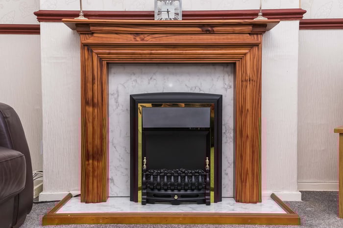 To the front, the carpeted living room has a feature fireplace, decorative cornice work, and a built-in storage cupboard. Set off the living room to the rear, the kitchen has space for a dinner/breakfast table, whilst contemporary fitted units include stone effect worktops, a sink with drainer, a tiled surround, an integrated electric oven and a gas hob.