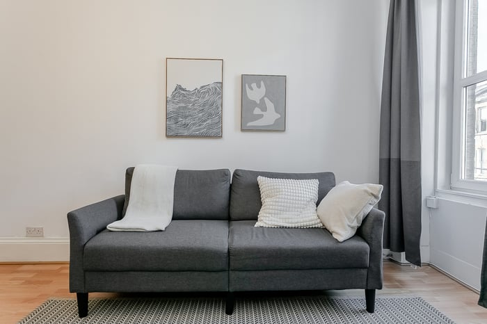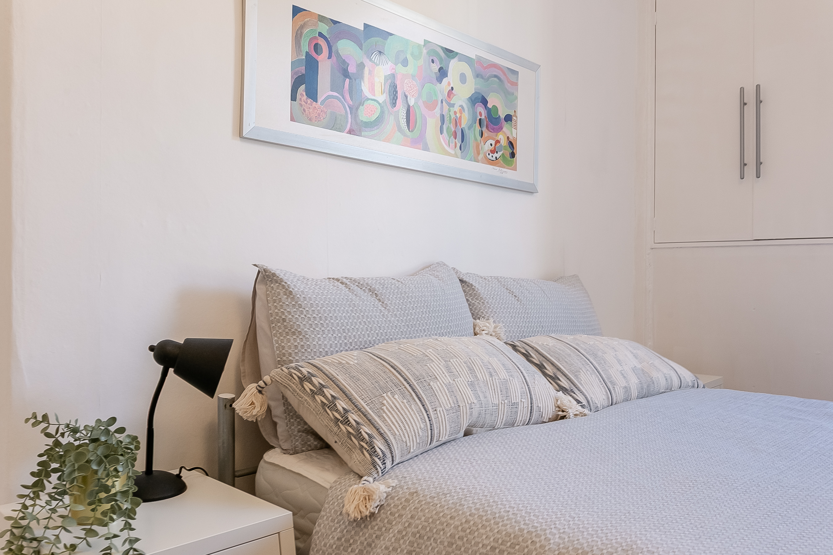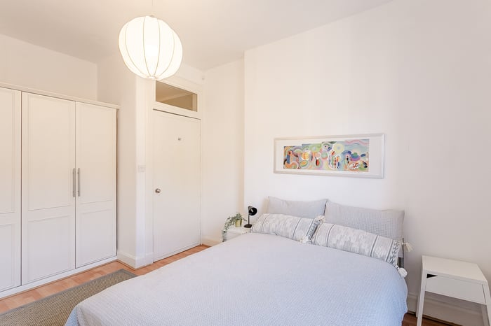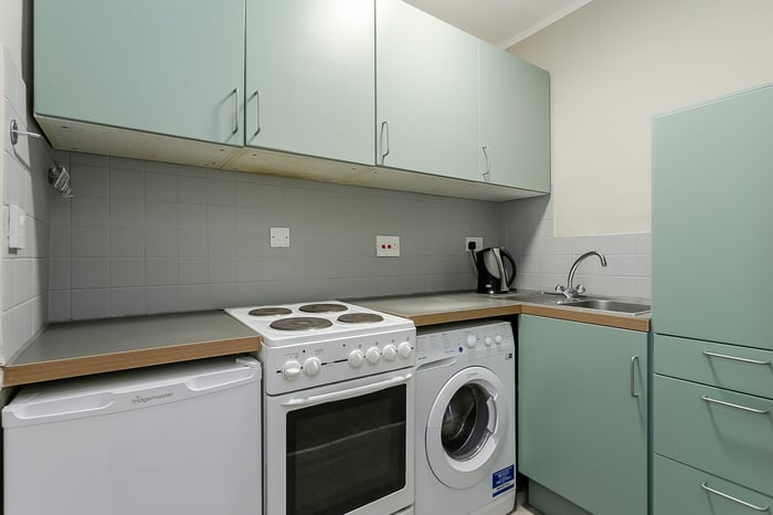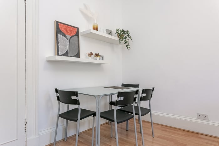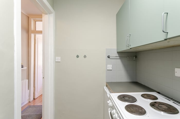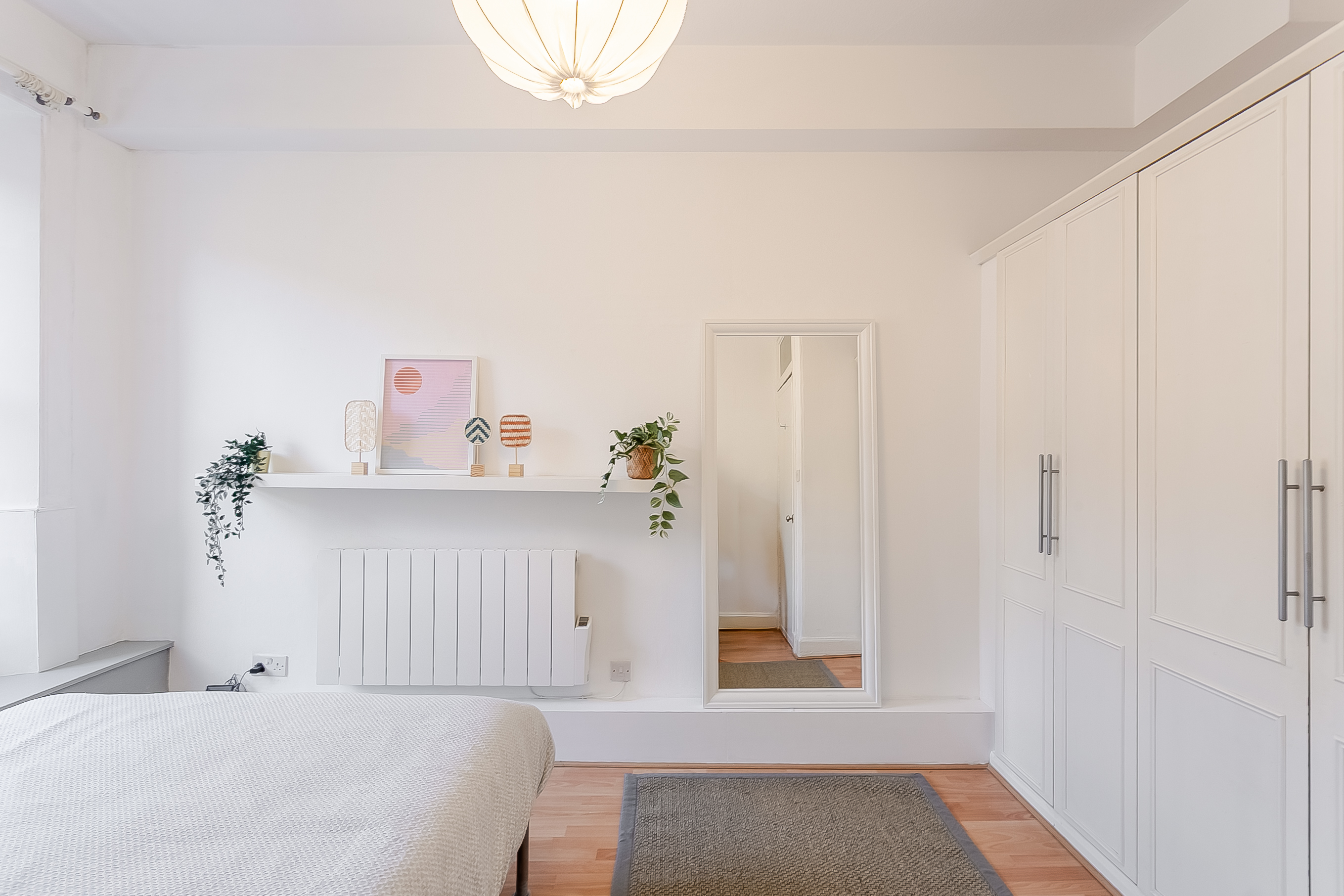 Set to the rear, the kitchen is well-appointed with a range of wall and base units, stone-effect worktops, tiled splashbacks, a sink with a drainer, and space for freestanding appliances. The spacious double bedroom is tastefully finished in light decor with wood-effect flooring and benefits from a large built-in wardrobe, a charming window seat, additional built-in storage, and a bespoke shelving feature.