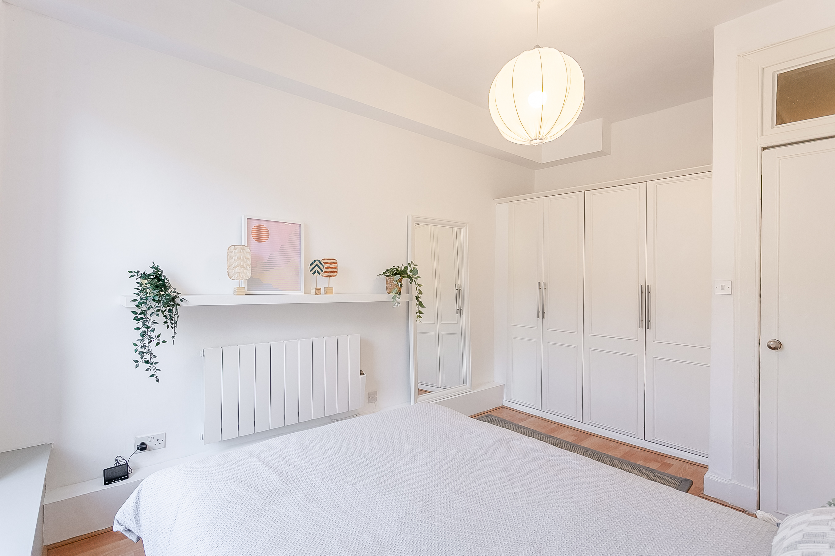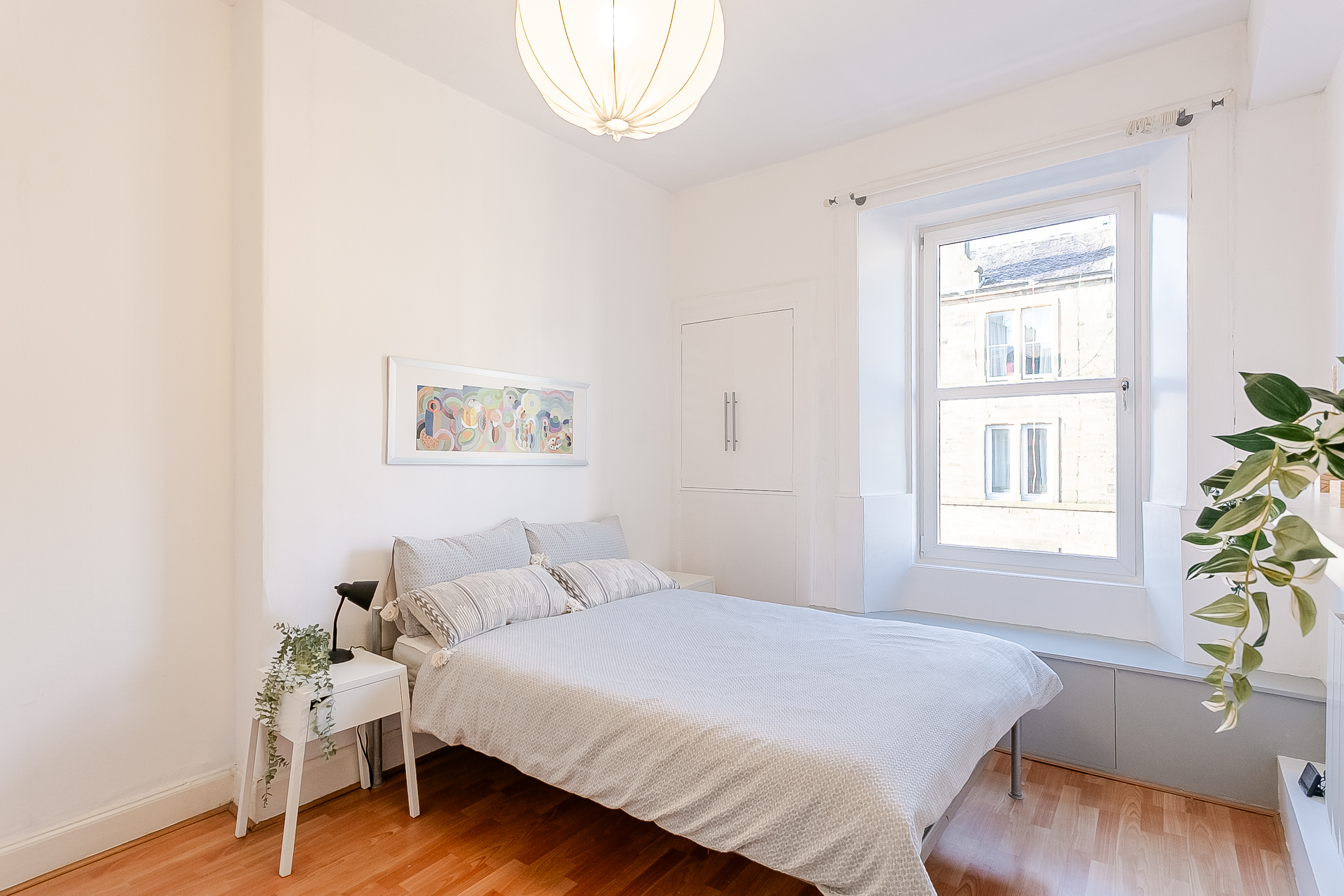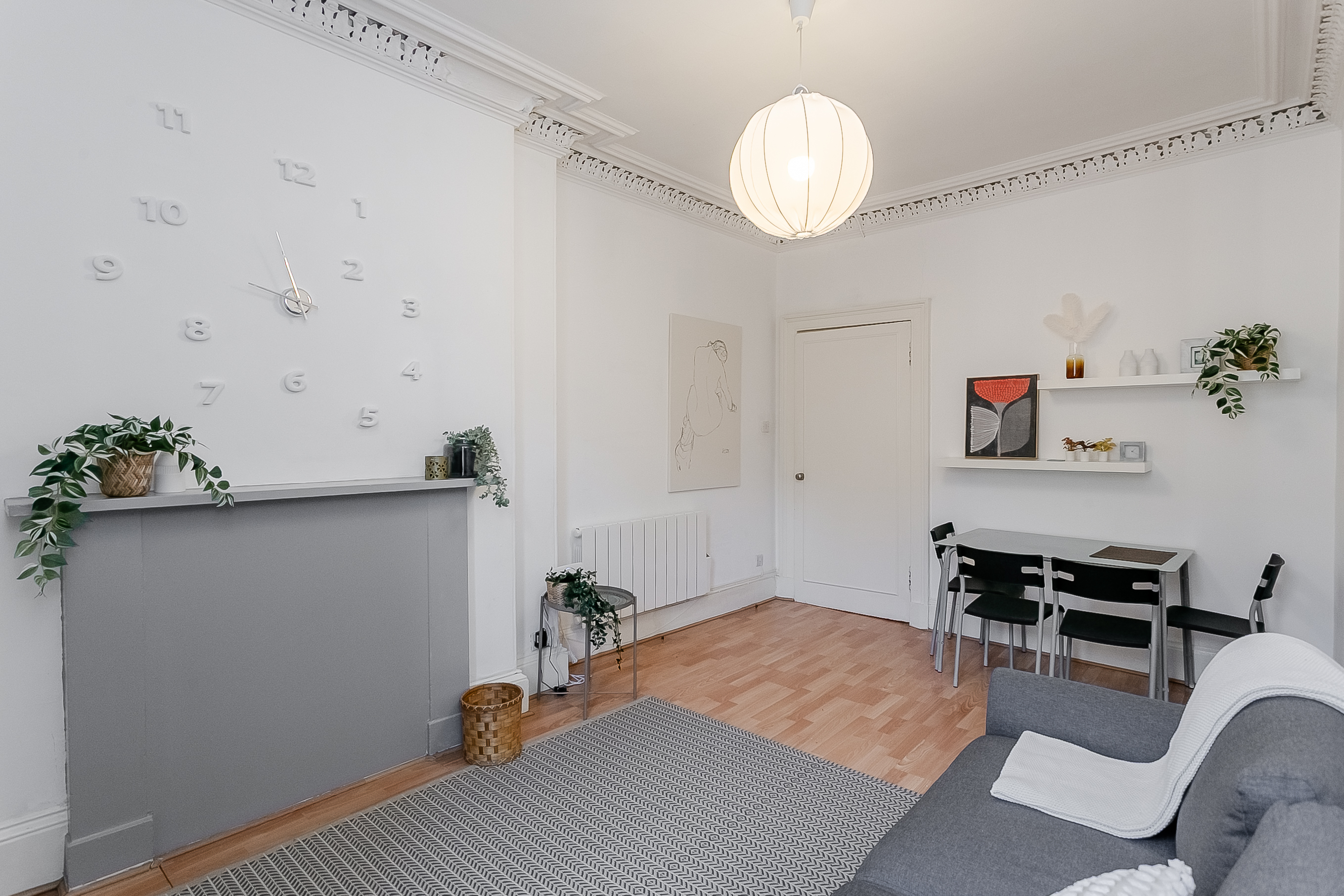 Beautifully presented one-bedroom flat, situated on the second floor of a traditional stone-built tenement, quietly positioned on a side street in the heart of Edinburgh’s ever-popular Newington area, just south of the city centre. The property is accessed via a welcoming entrance hall, which offers space for outerwear and provides access throughout. The generous living room enjoys a desirable west-south-facing aspect, allowing an abundance of natural light, and is finished with light, neutral decor, wood-effect flooring, period ornate cornicing, a feature fireplace surround, and a useful built-in cupboard.