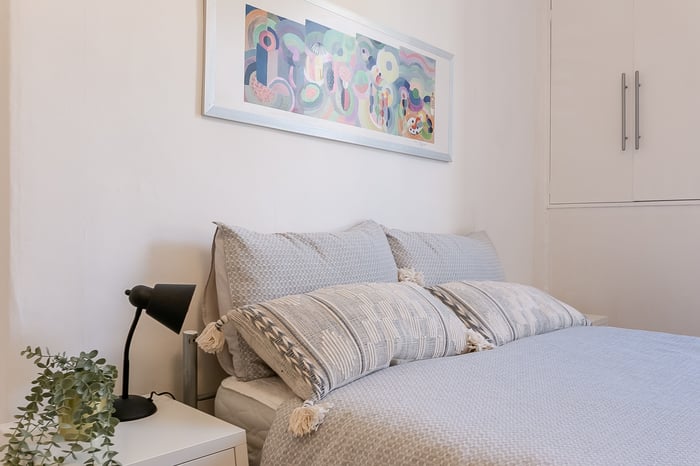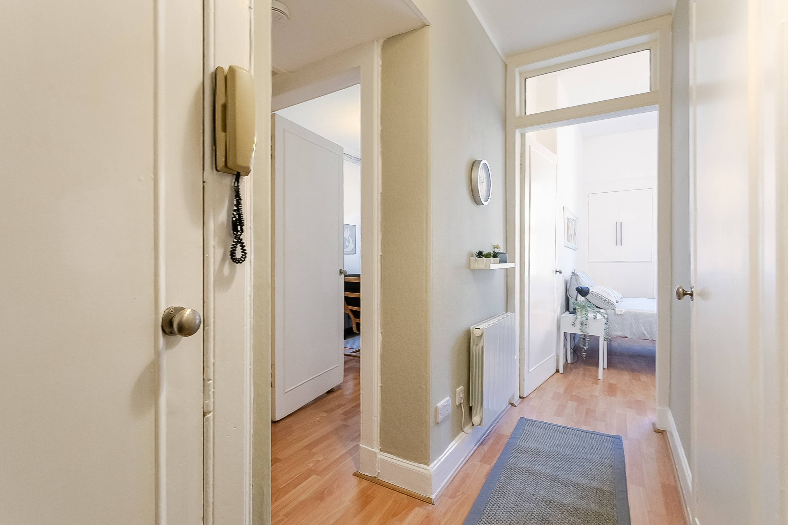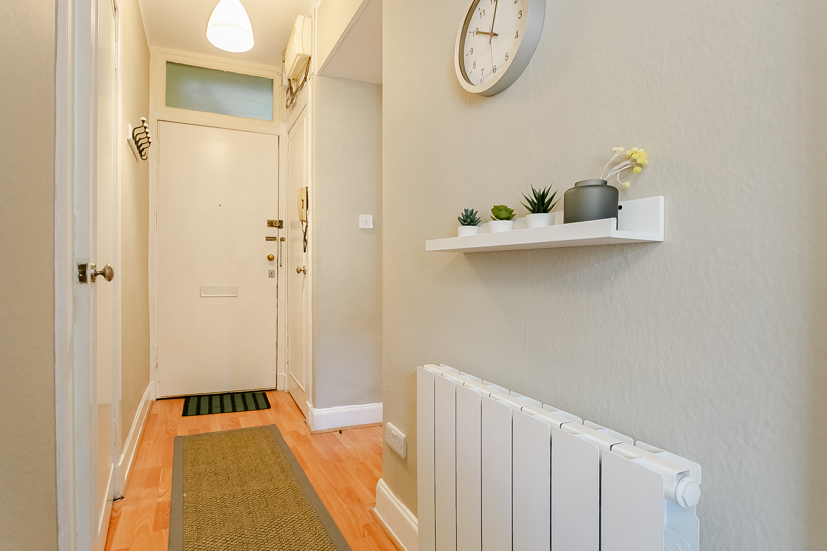 Beautifully presented one-bedroom flat, situated on the second floor of a traditional stone-built tenement, quietly positioned on a side street in the heart of Edinburgh’s ever-popular Newington area, just south of the city centre. The property is accessed via a welcoming entrance hall, which offers space for outerwear and provides access throughout. The generous living room enjoys a desirable west-south-facing aspect, allowing an abundance of natural light, and is finished with light, neutral decor, wood-effect flooring, period ornate cornicing, a feature fireplace surround, and a useful built-in cupboard.