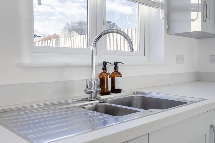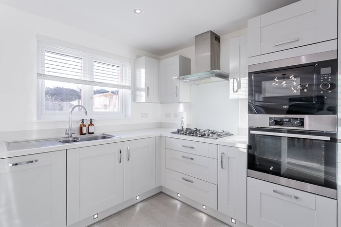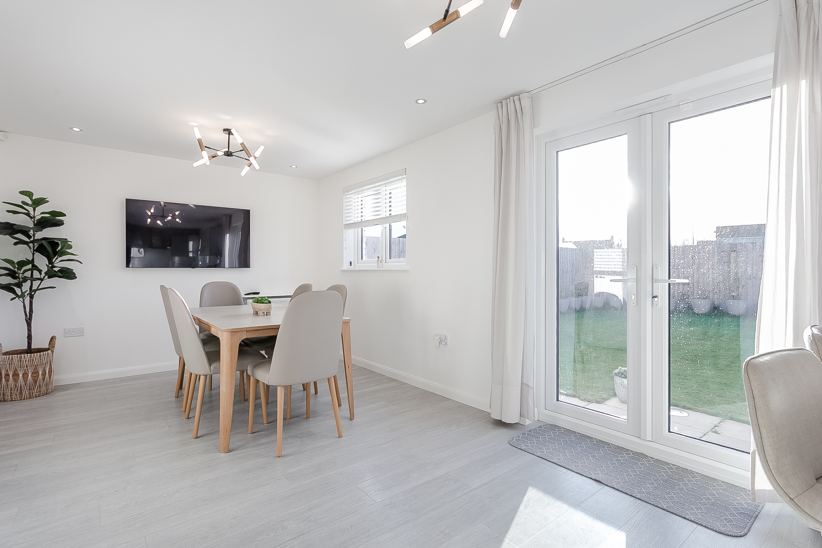 The hallway includes a convenient WC before flowing into the modern open-plan kitchen and dining area at the rear, a bright social space offering direct access to the garden—perfect for entertaining. The kitchen boasts stylish finishes, modern countertops with matching upstands, a stainless-steel sink with a drainer, and integrated appliances, including an oven, a five-ring gas hob with a canopy, a microwave, a dishwasher, and a fridge-freezer.