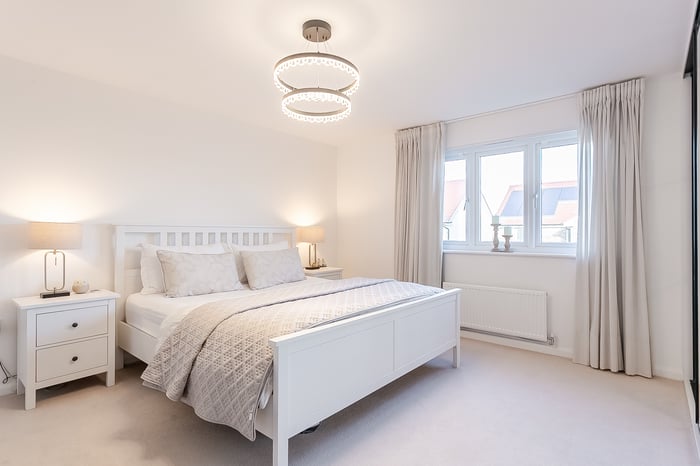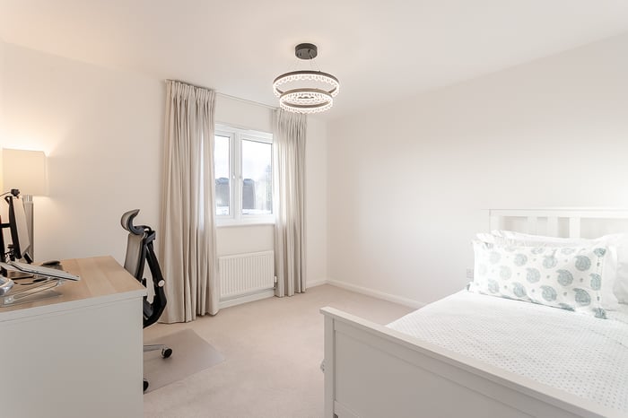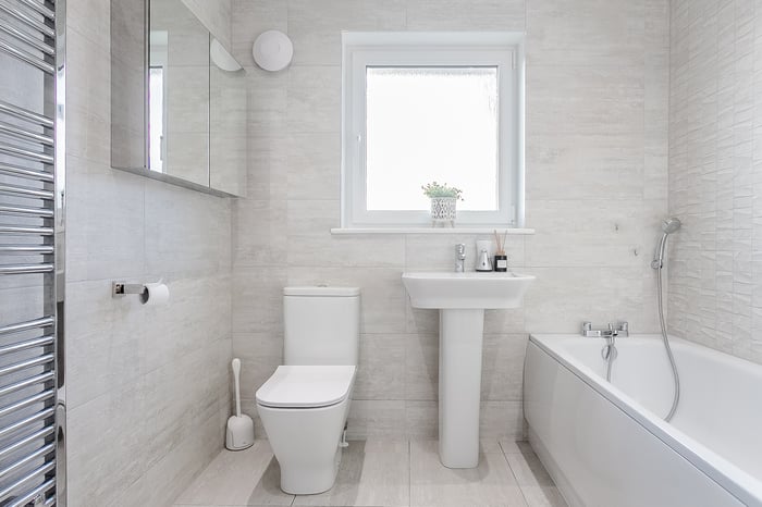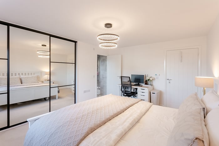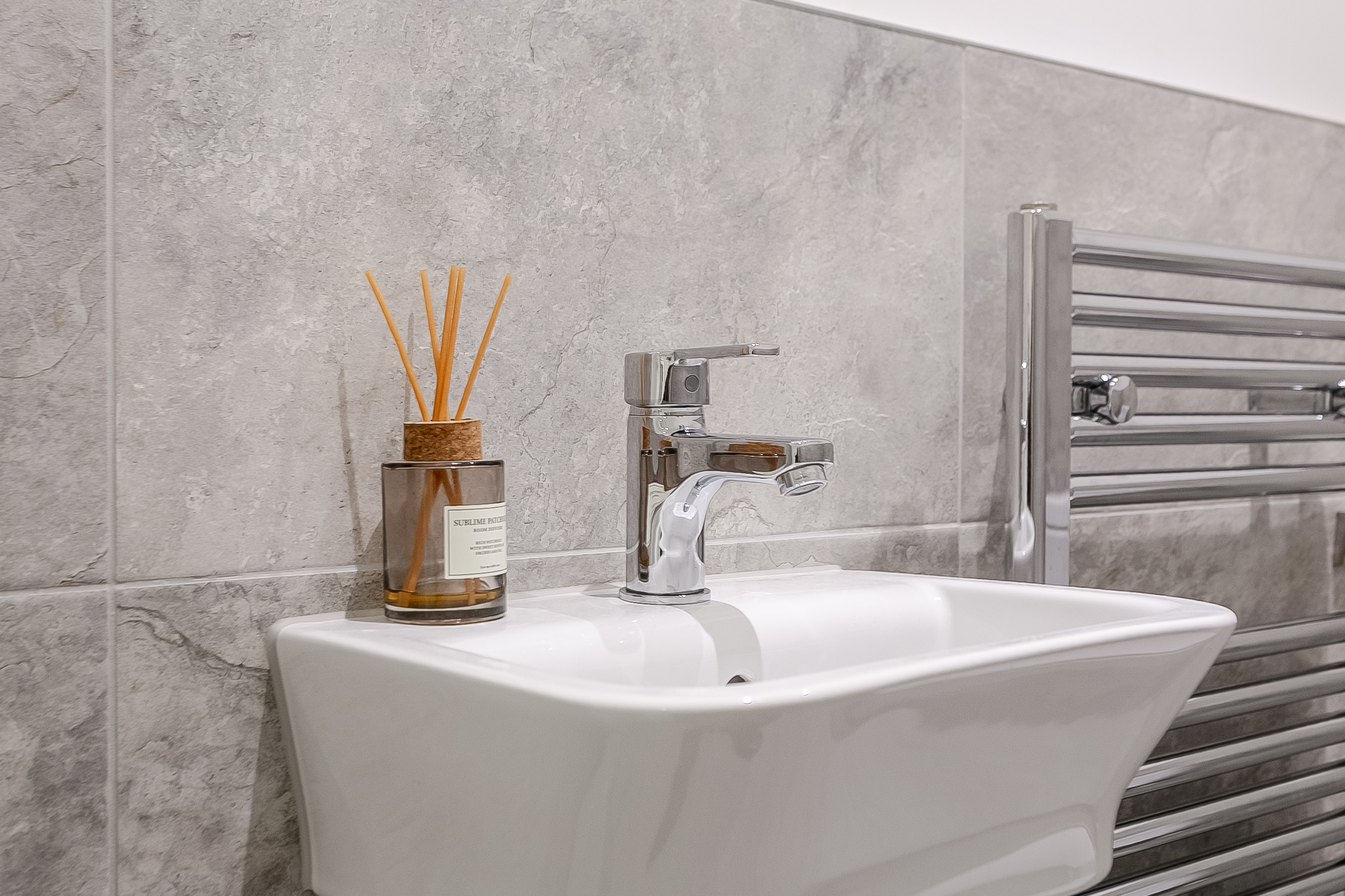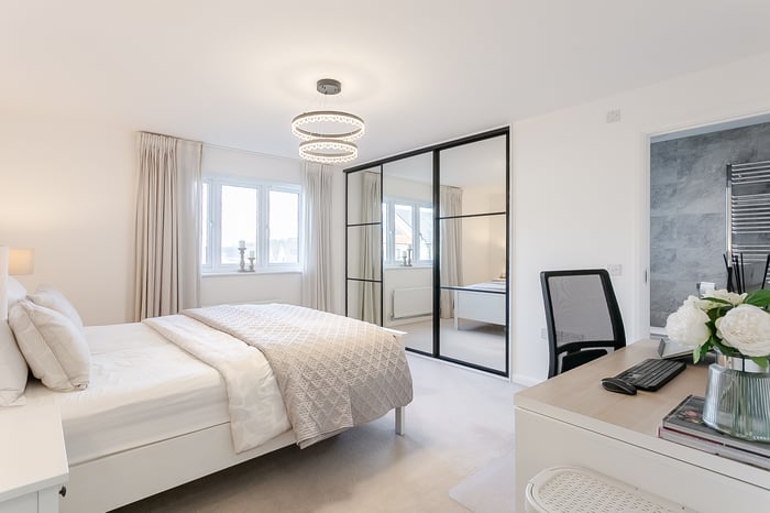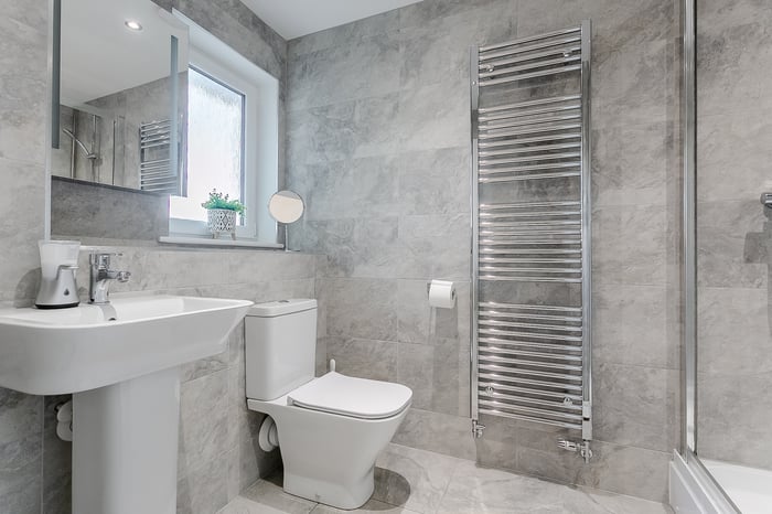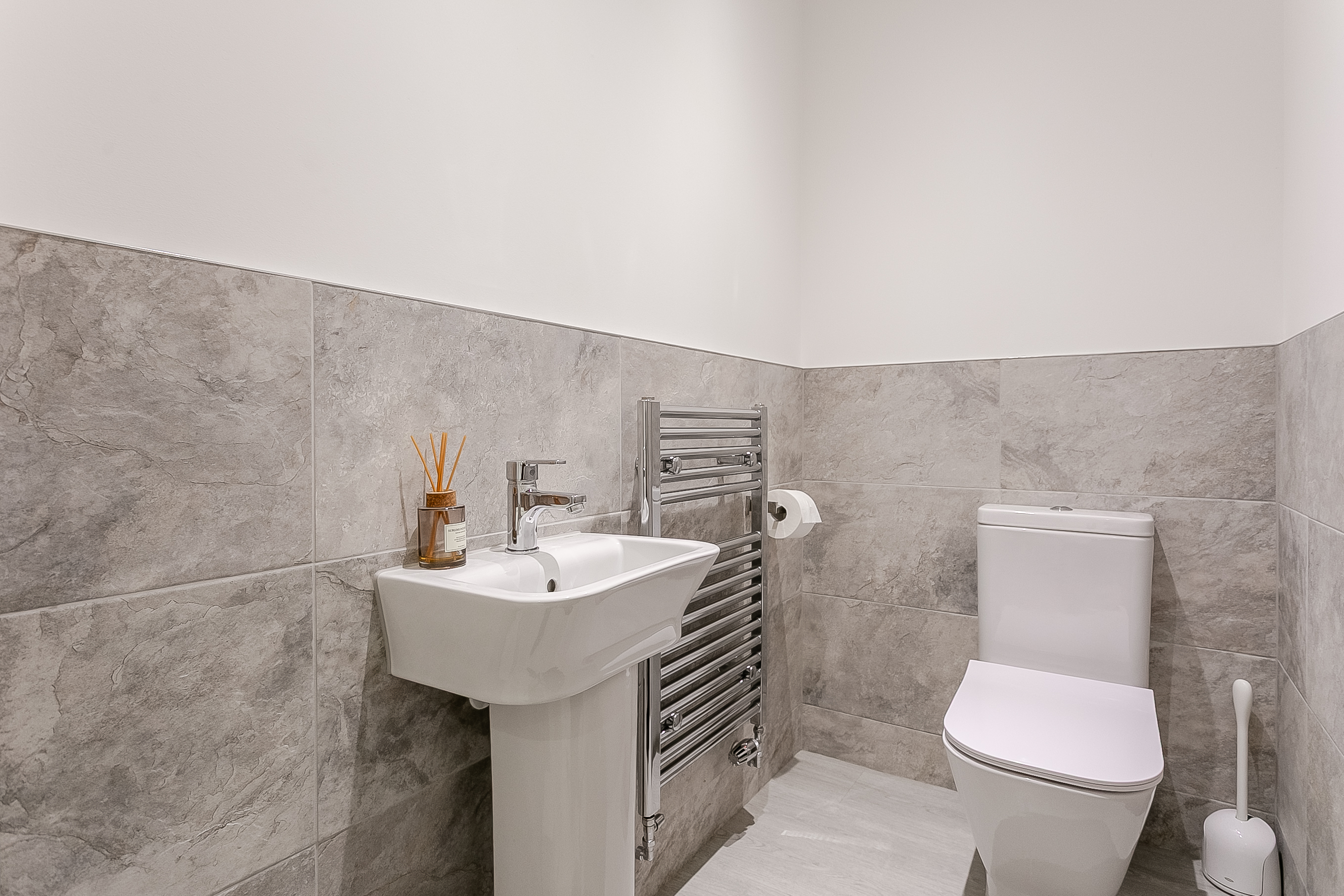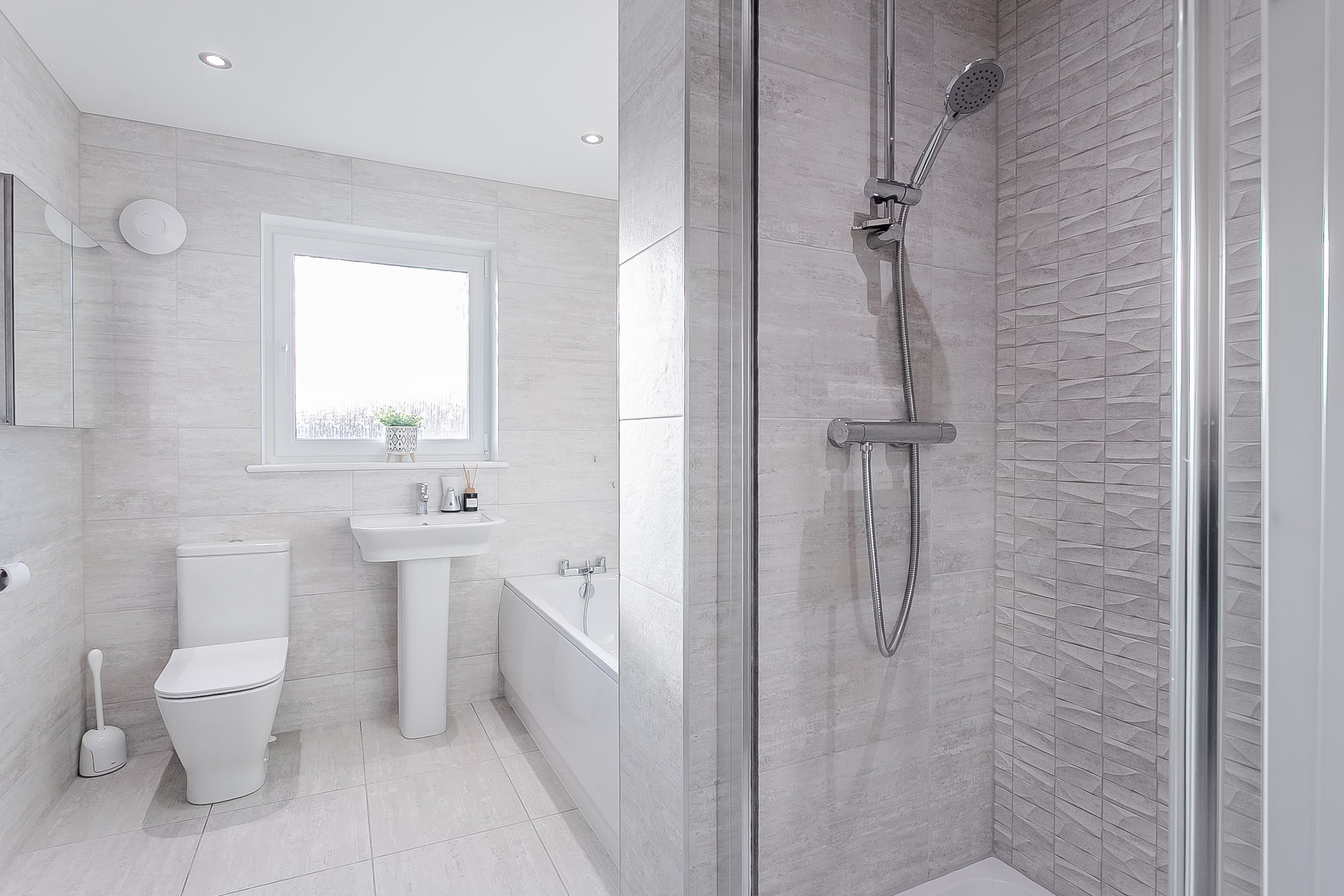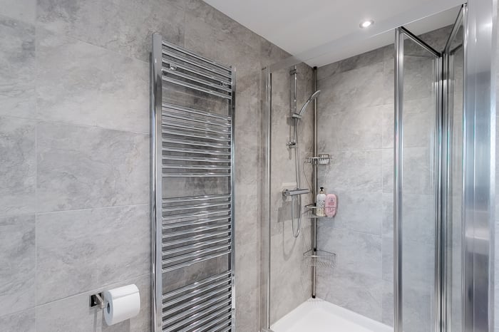 The master bedroom also includes a mirrored built-in wardrobe and a fully tiled en-suite with a shower cubicle and ladder-style radiator. Completing this family home is the main bathroom—a four-piece suite with both a shower cubicle and bathtub, plus a ladder-style radiator.