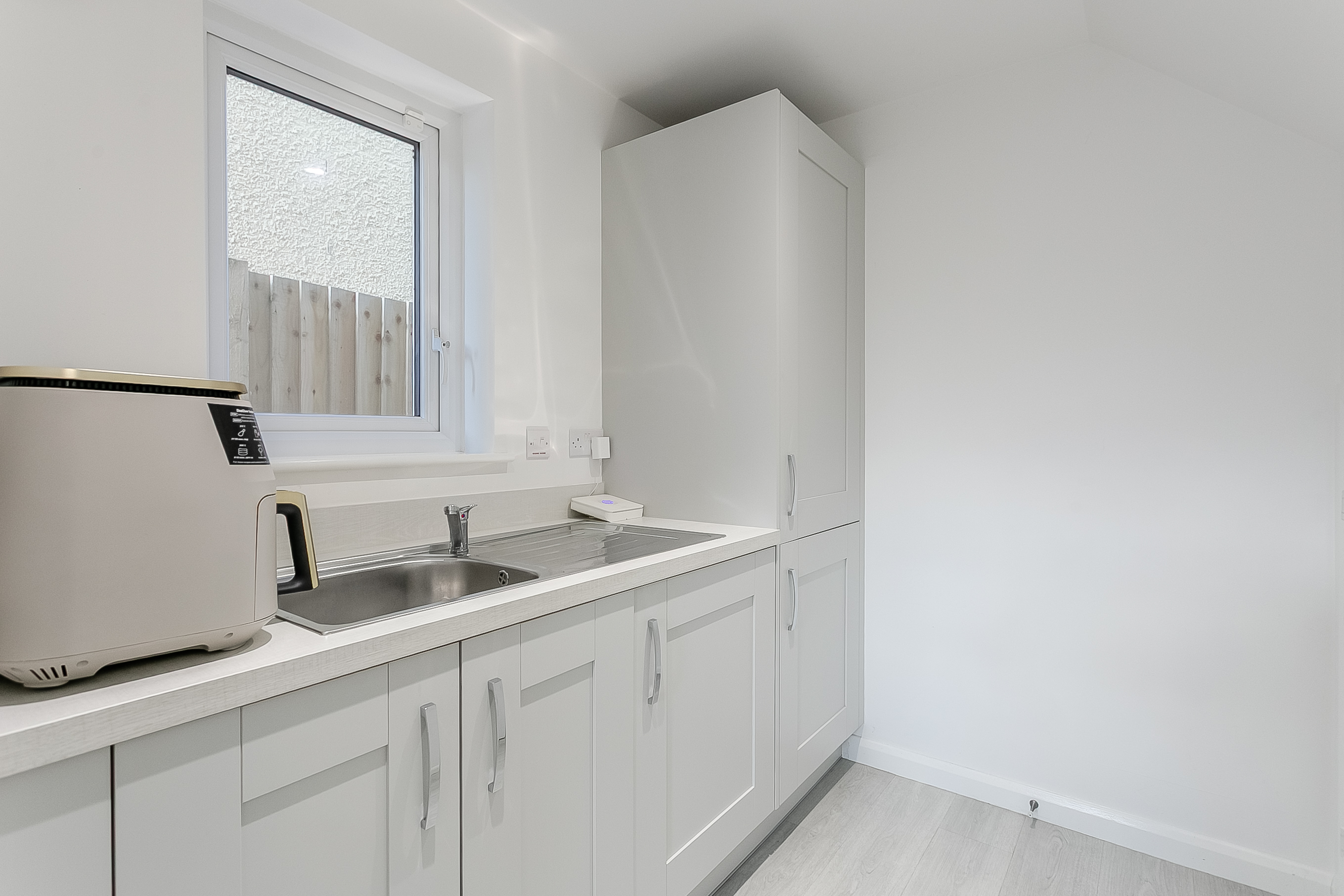 A separate utility room provides additional practicality with its own stainless-steel sink and washing machine. Upstairs, all four carpeted bedrooms are accessed from the landing, with bedrooms two and three offering mirrored built-in wardrobes, and bedroom four featuring light décor.