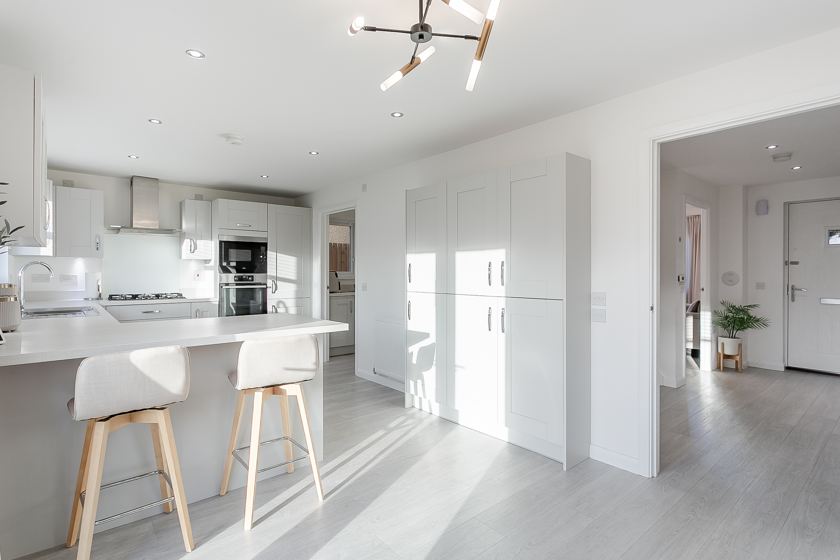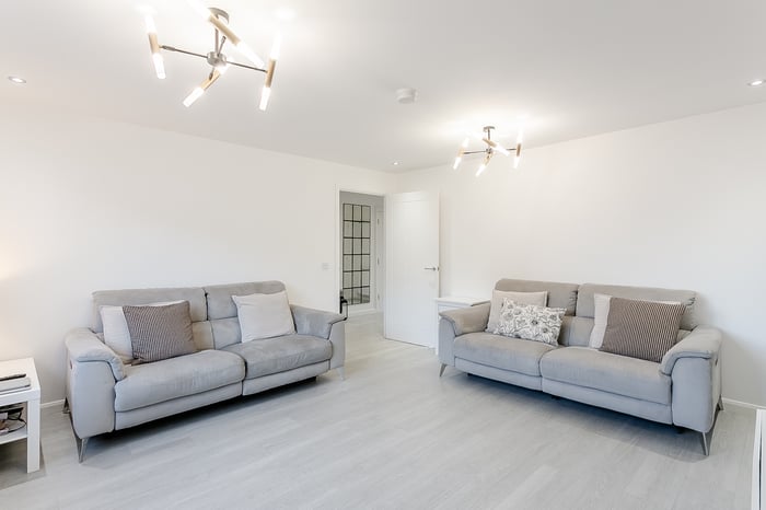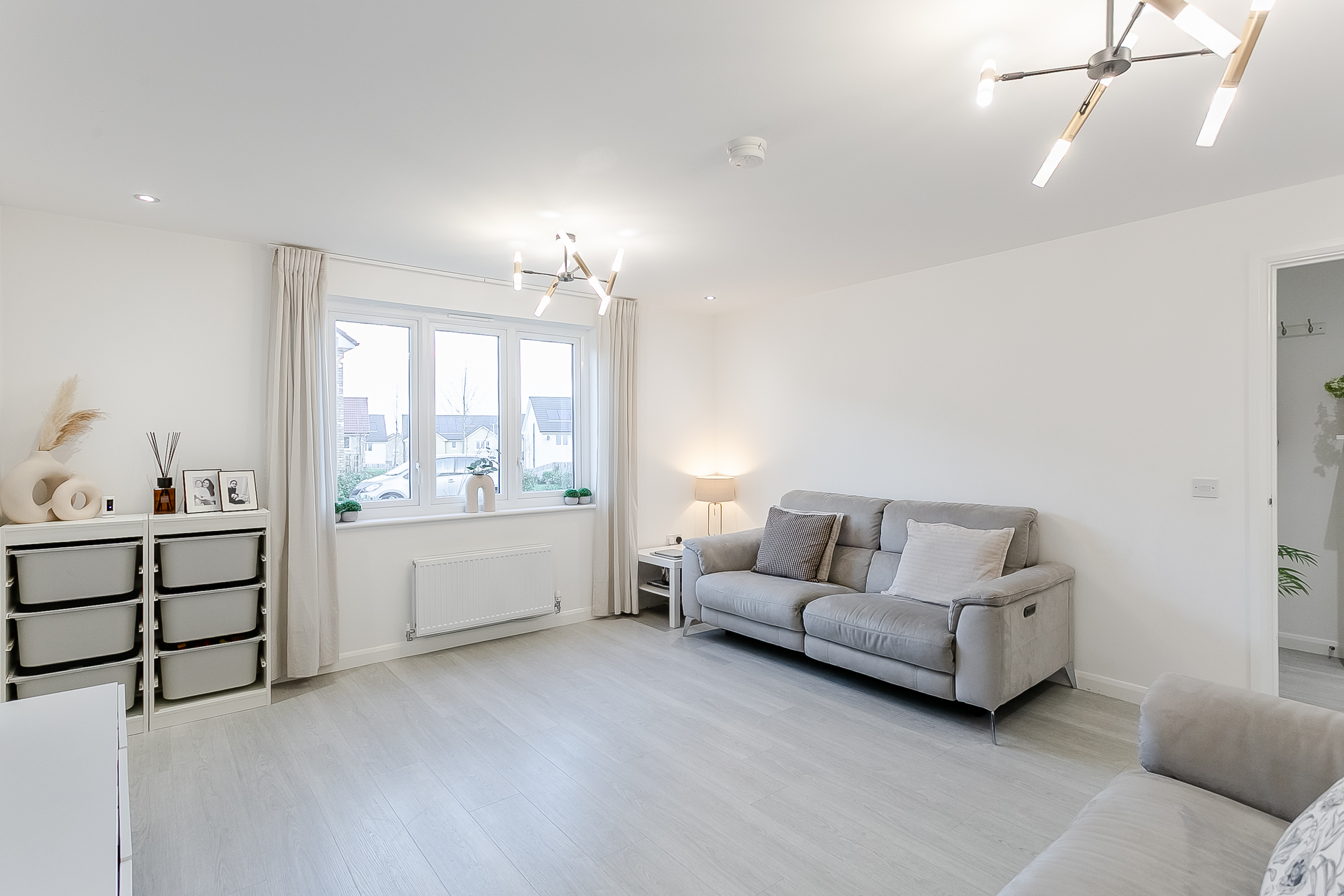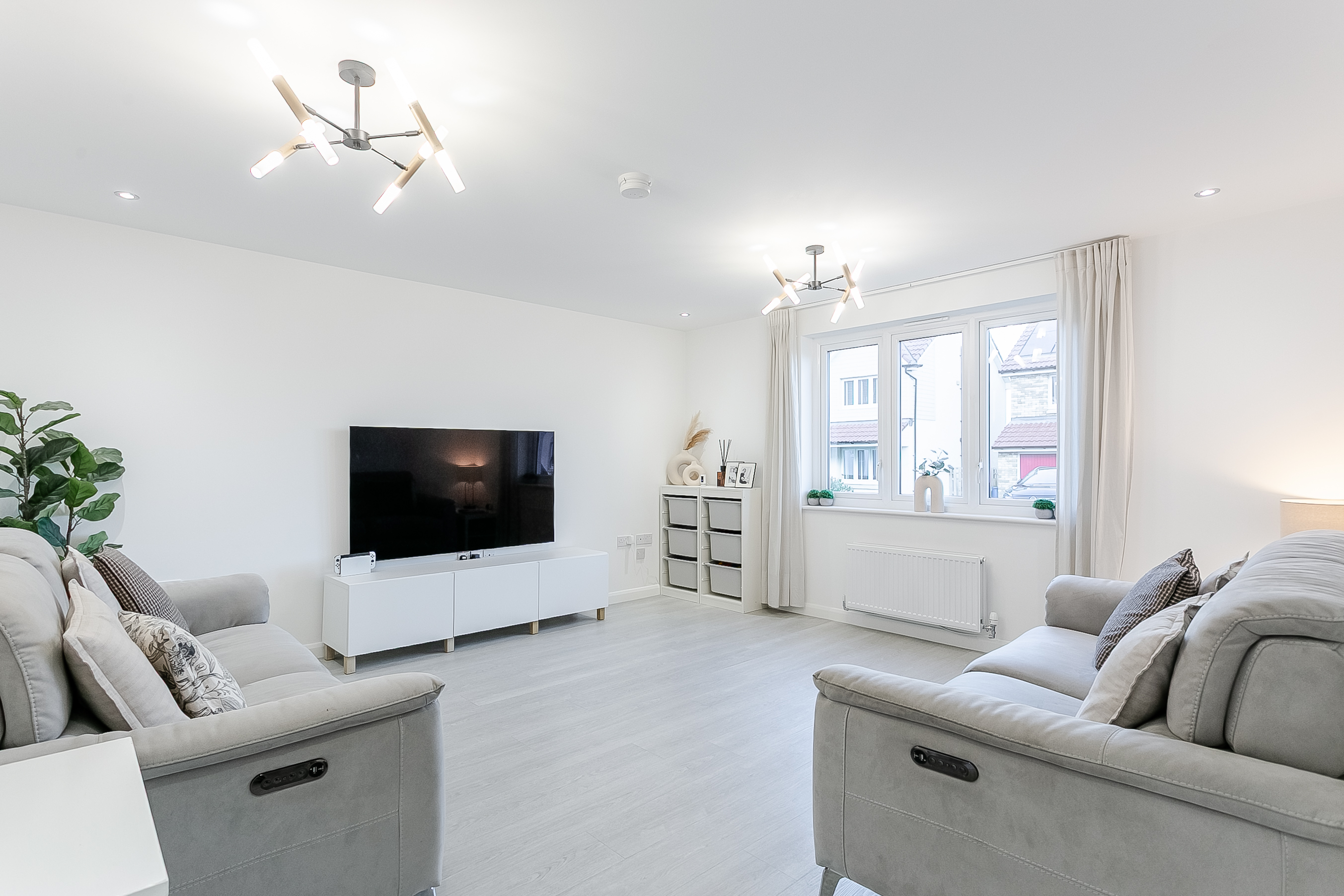 Immaculately presented and spacious, four-bedroom, detached family home with gardens, double driveway, and an integrated garage. Forming part of a sought-after modern residential development in East Calder, West Lothian. A welcoming entrance leads into the home, with the living room set to the side, featuring contemporary flooring and light décor.