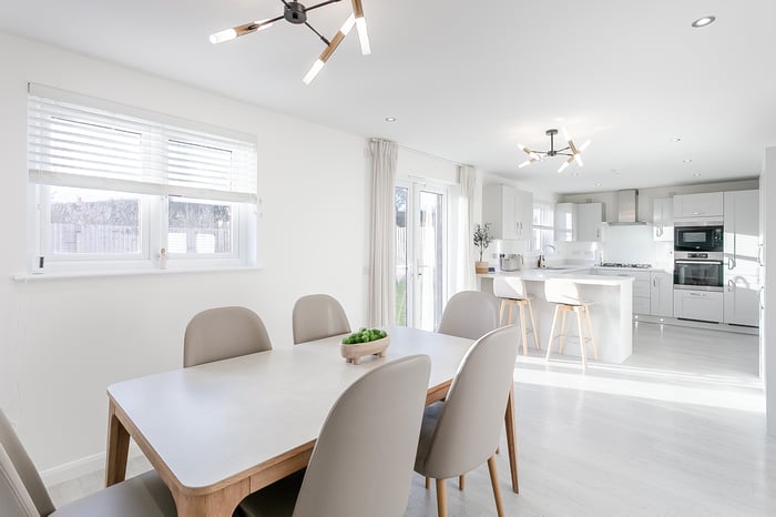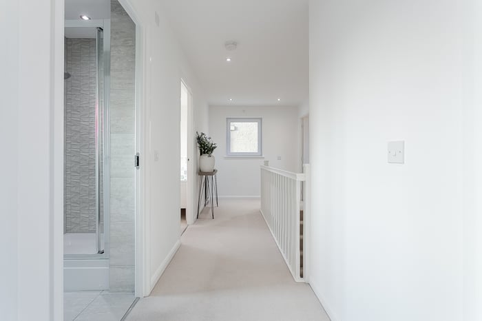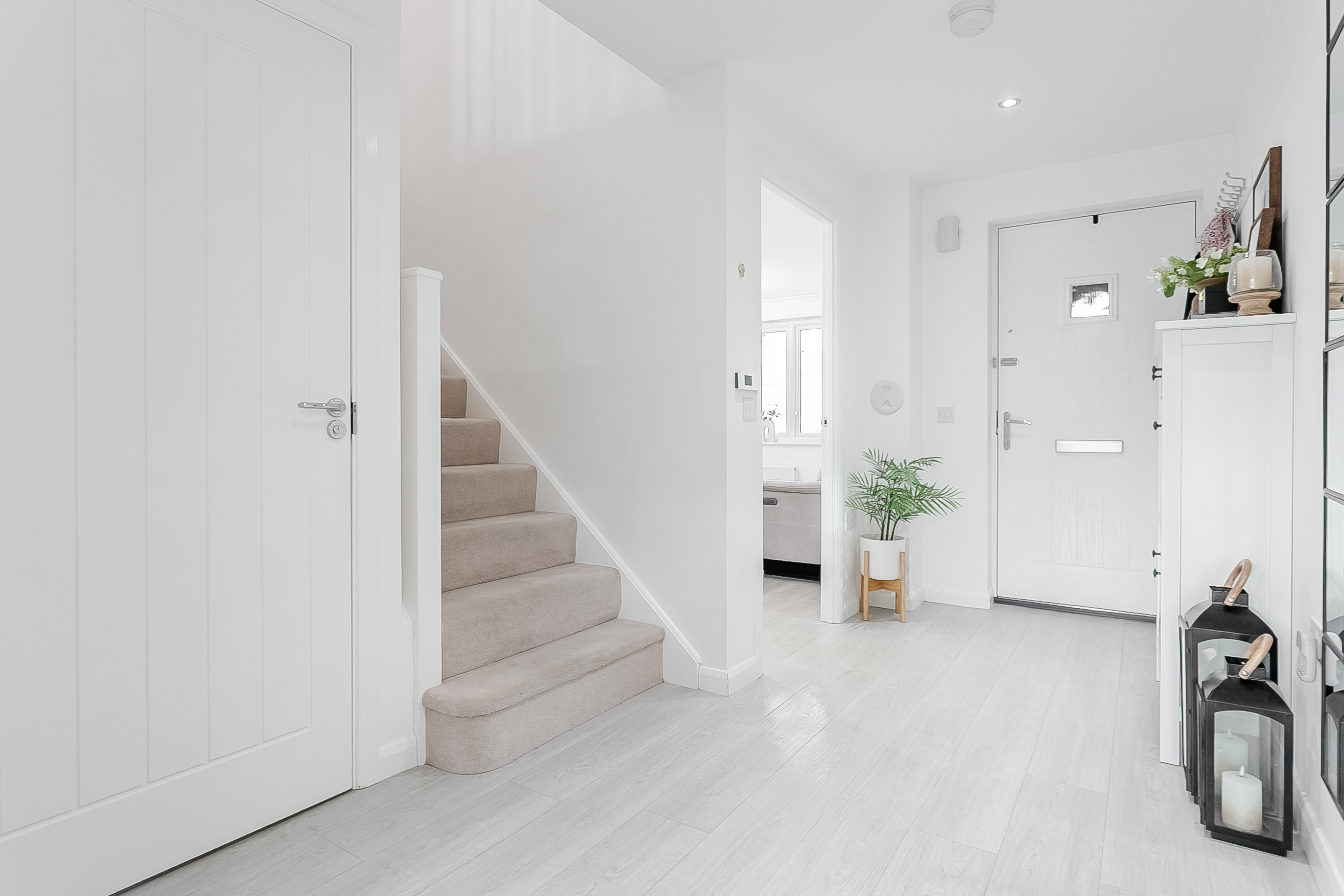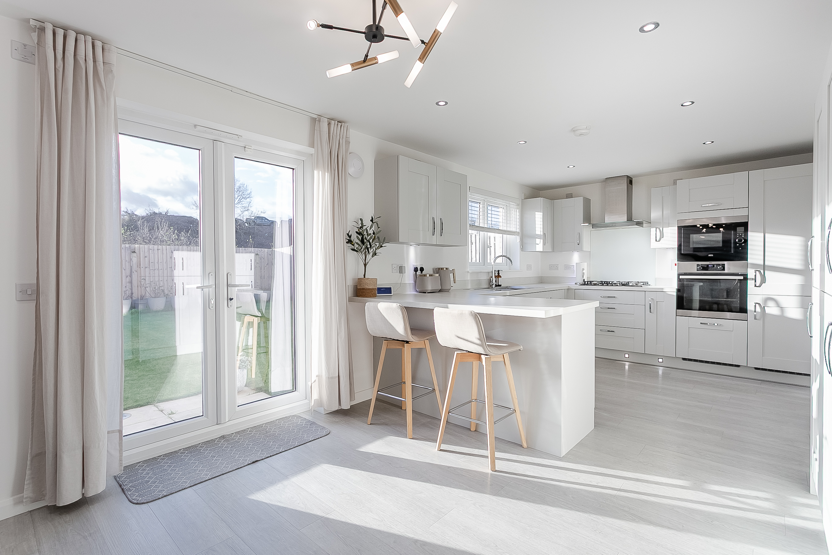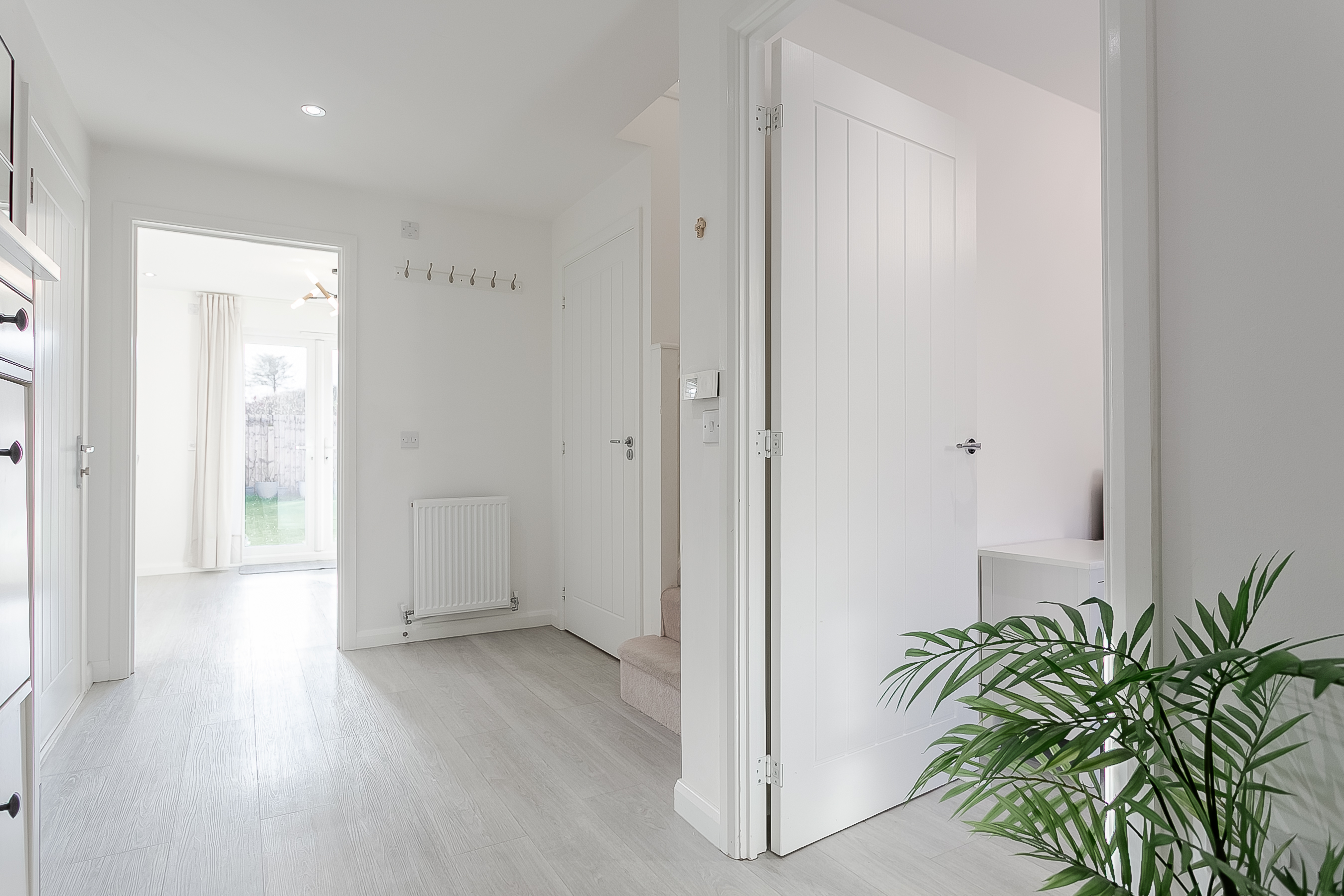 Immaculately presented and spacious, four-bedroom, detached family home with gardens, double driveway, and an integrated garage. Forming part of a sought-after modern residential development in East Calder, West Lothian. A welcoming entrance leads into the home, with the living room set to the side, featuring contemporary flooring and light décor.