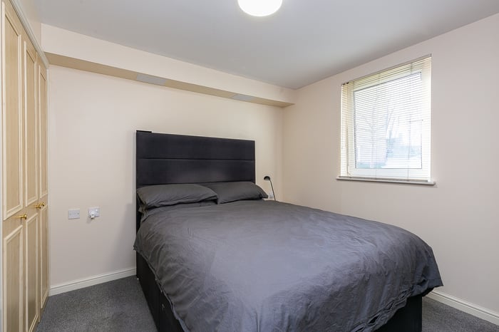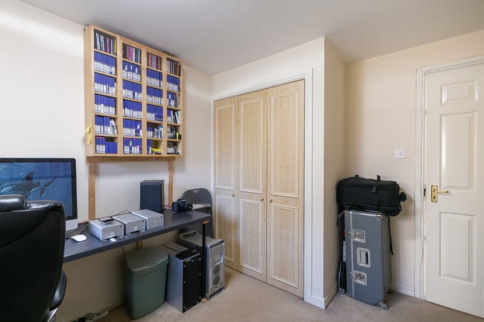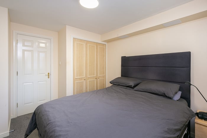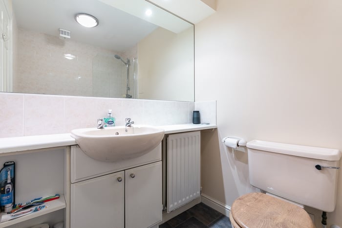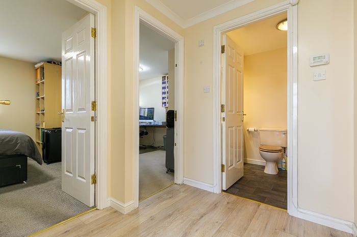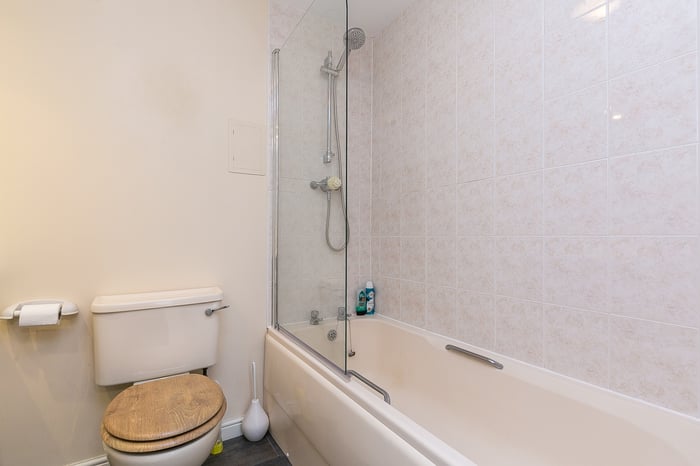 Set to the rear, bedroom one is generously sized with carpeted flooring, a central light fitting and a built-in wardrobe; whilst bedroom two, is also set to the rear, similarly well-sized and finished (presently set up as a home office/study). Completing the accommodation, the bathroom, is fitted with a three-piece suite, a mains mixer shower over the bath, tiled splash walls and non-slip vinyl flooring.