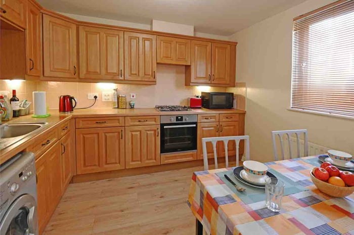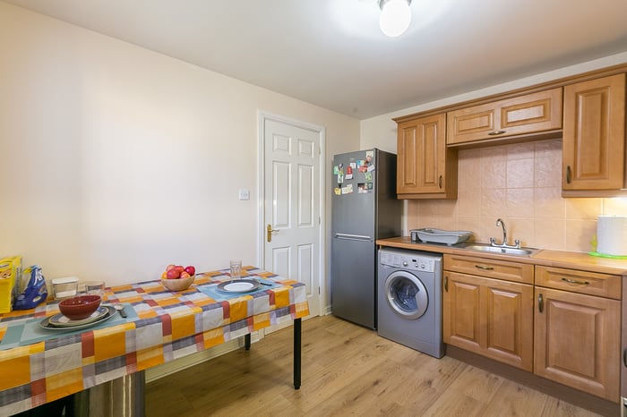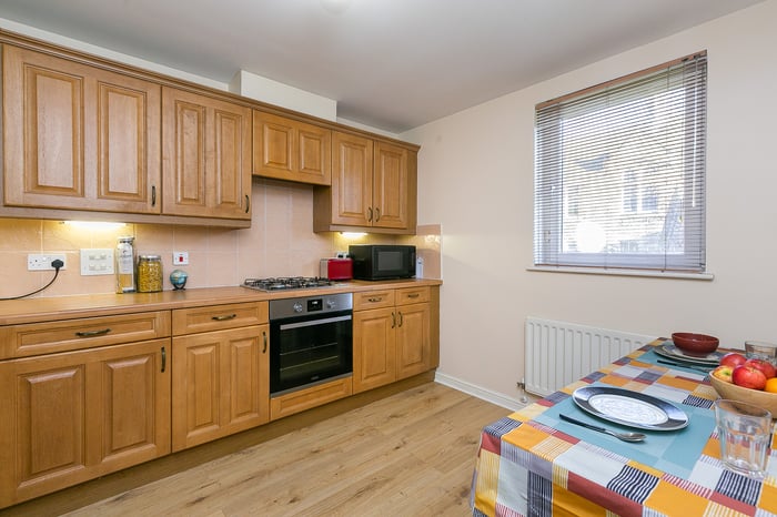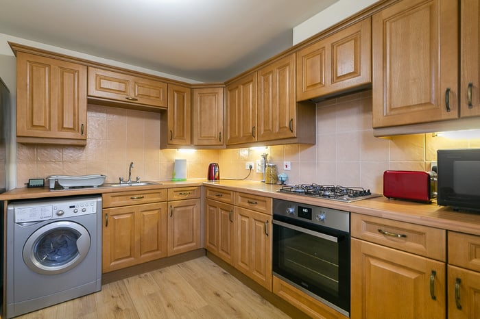 Set off the living room, with ample space for dining, the kitchen is fitted with traditional wall and base units, wood effect worktops, a tiled surround, a sink with drainer and laminate flooring. Newly (2021) purchased appliances include an integrated oven and gas hob; and a freestanding washing machine and fridge/freezer.
