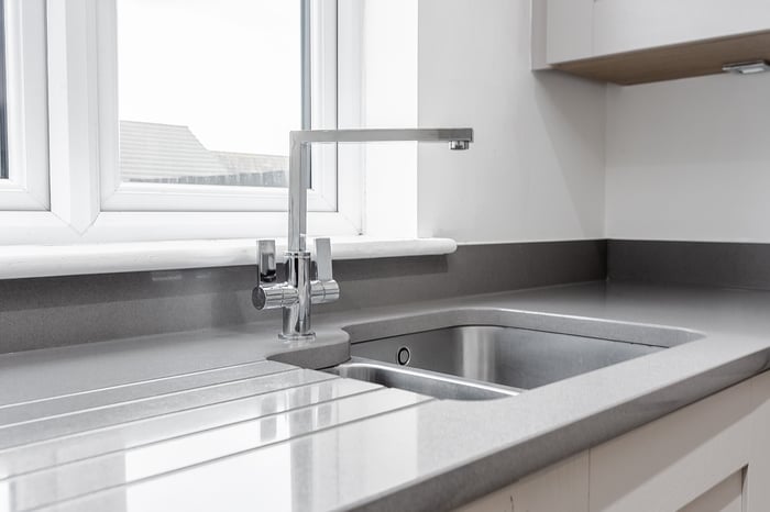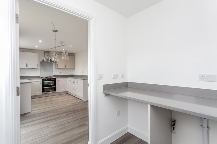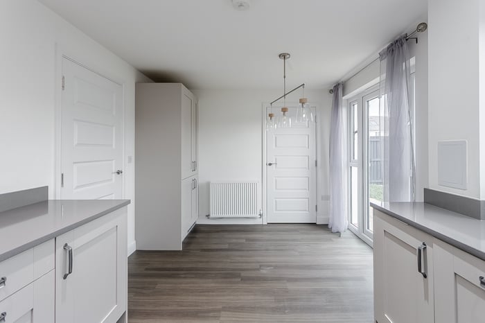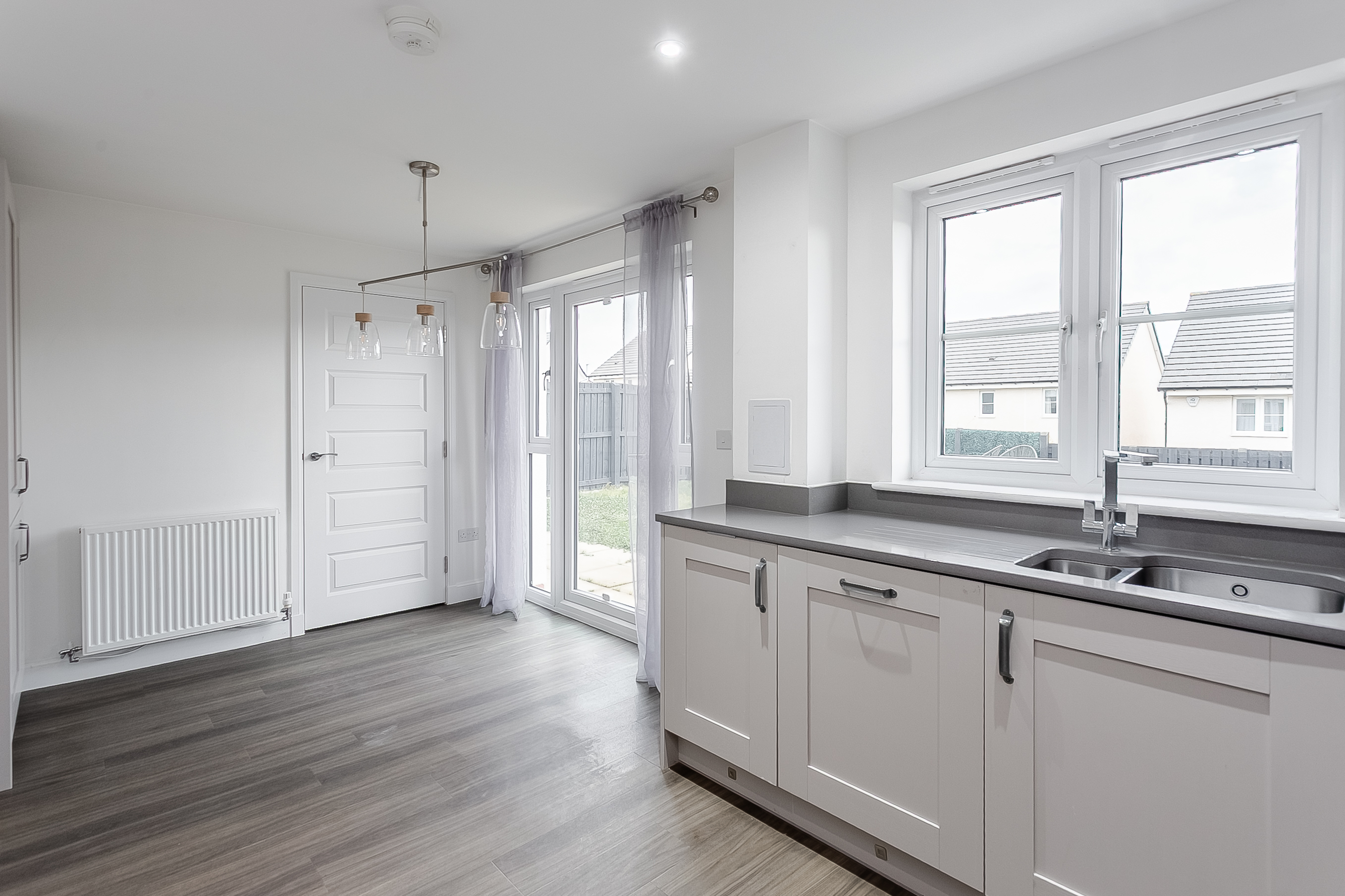 Set to the rear, the stylish kitchen/dining room enjoys modern fitted units with stone worktops, a sink with drainer, and a range of integrated appliances including a double oven, gas hob and fridge/freezer. Patio doors flood the space with natural light and open directly onto the private rear garden, while a contemporary light fitting creates an inviting dining area.