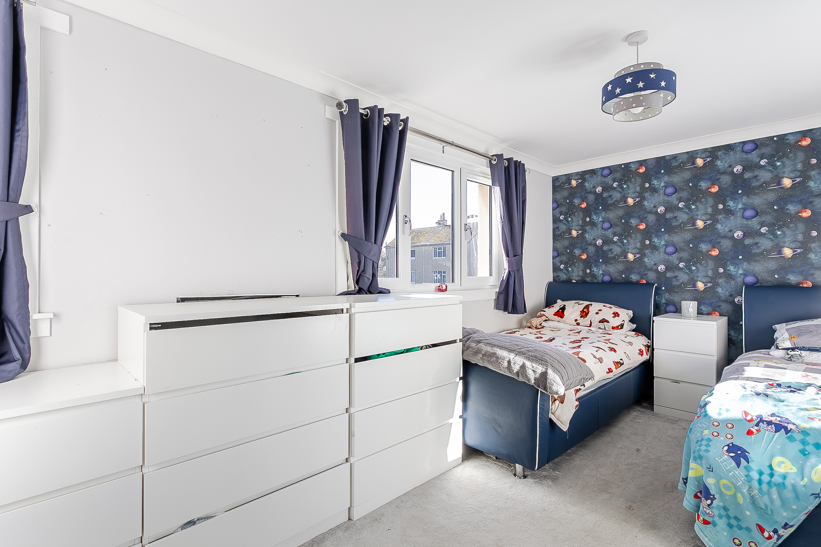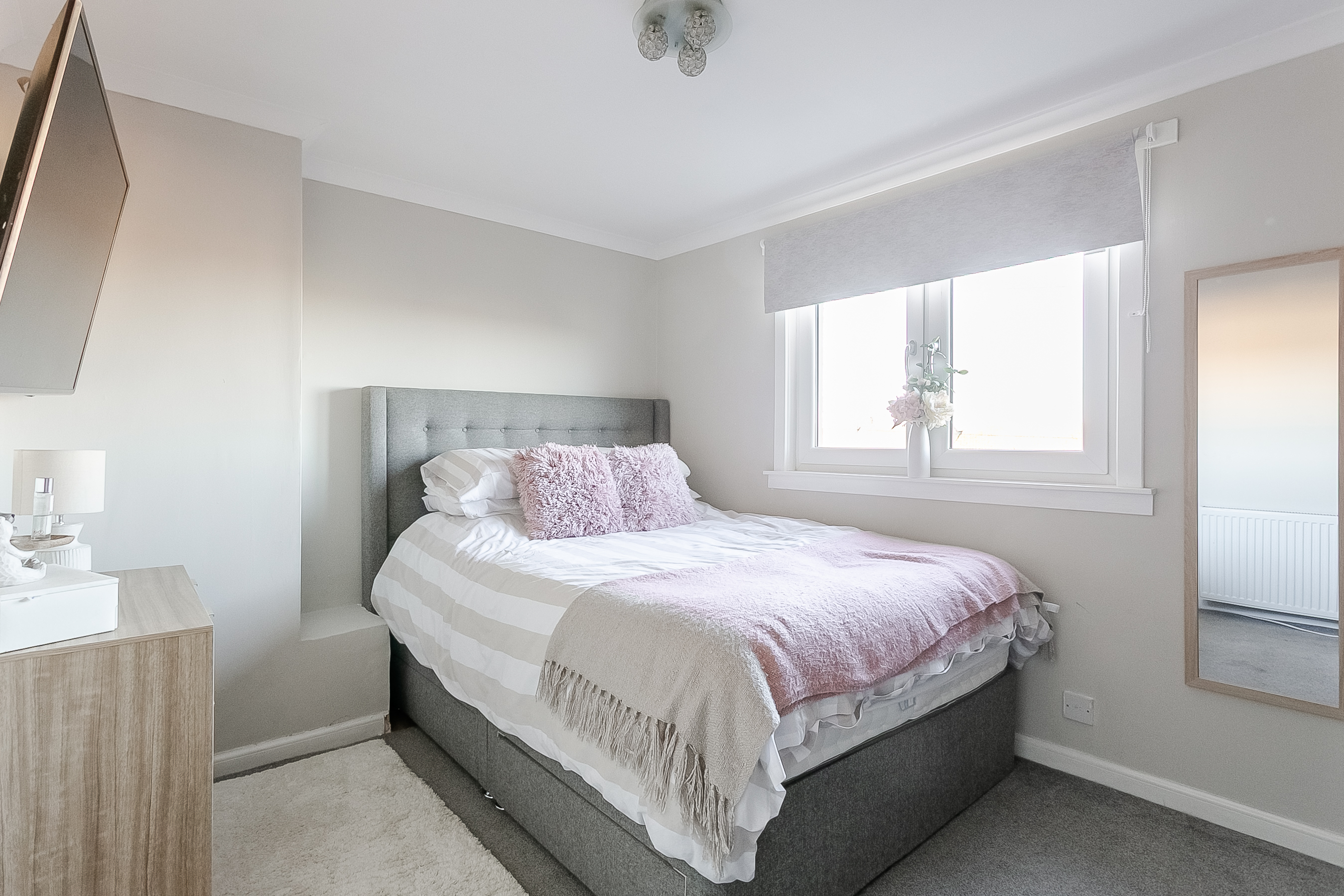 Upstairs, two double bedrooms offer built-in storage, wall-mounted TV points, and soft carpeting. The modern bathroom includes tiled flooring, a three-piece suite with a shower over the bath, and a ladder-style radiator.