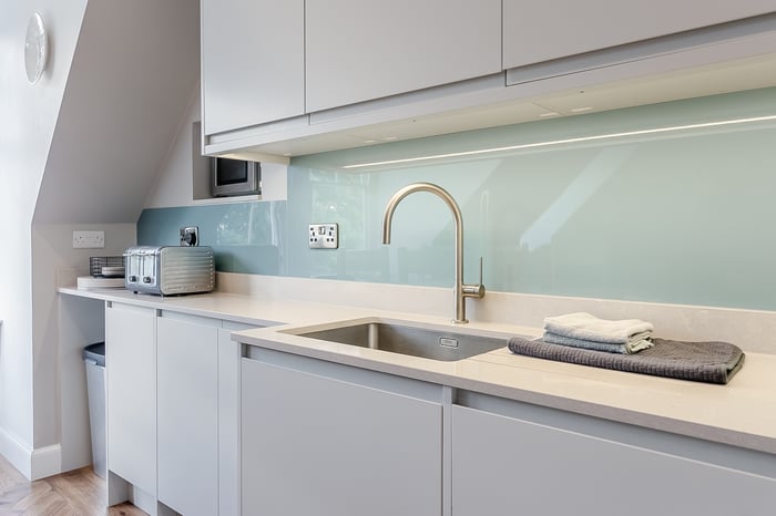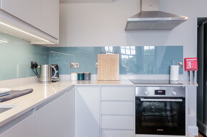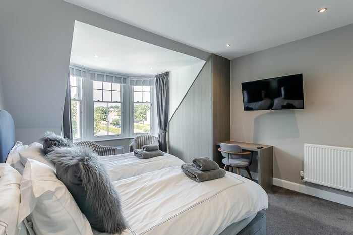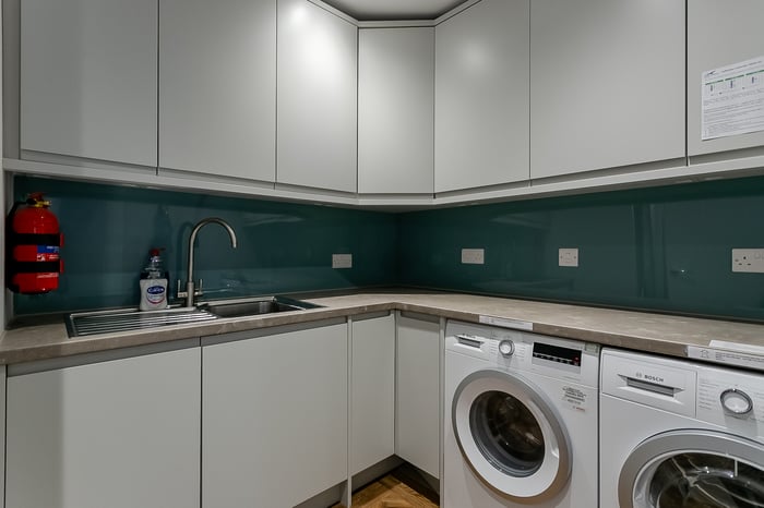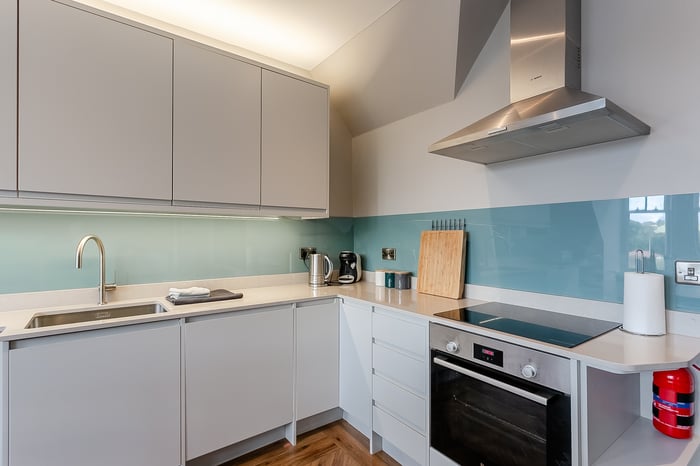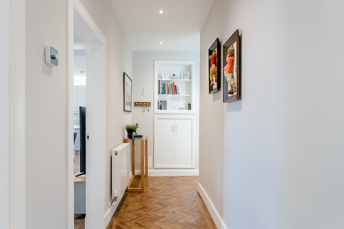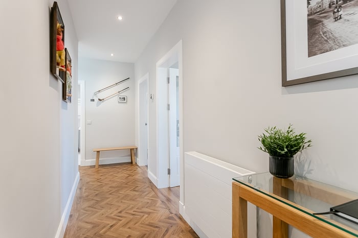 There’s ample space for a dining set and a dedicated area for a double fridge/freezer. The kitchen is fitted with modern worktops, a sleek splashback, a sink with drainer, and integrated appliances including an oven, electric hob with canopy, induction hob, and dishwasher, all complemented by a charming bay window.