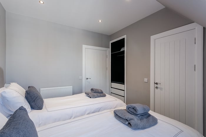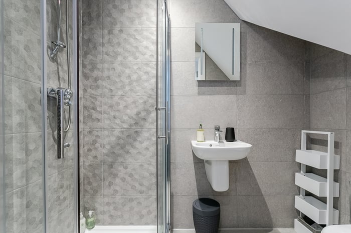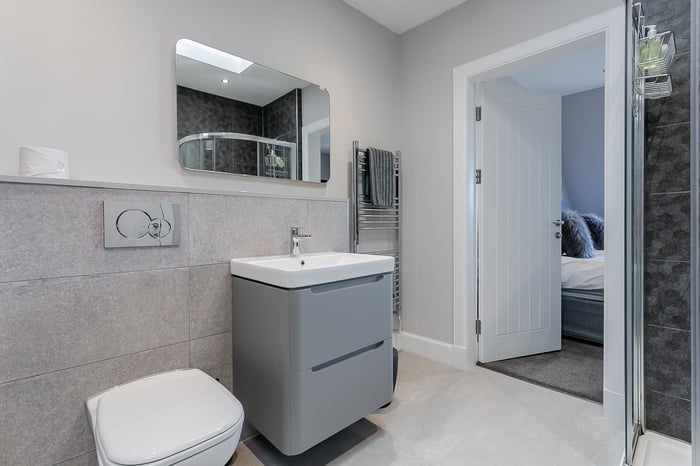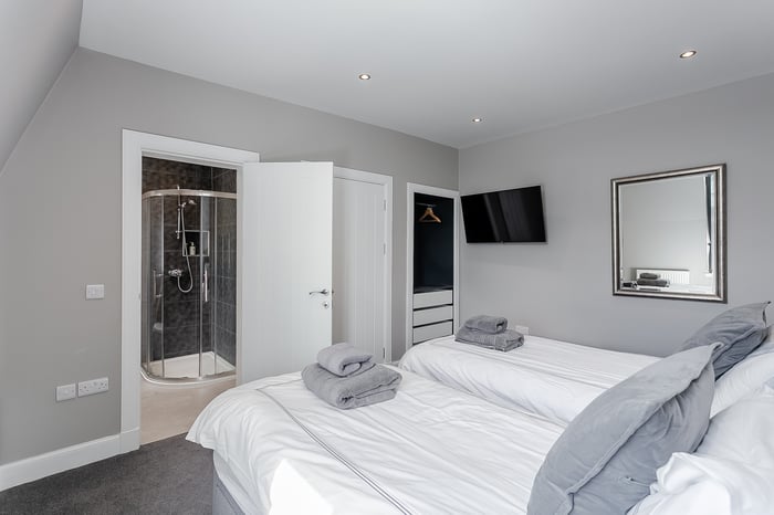 A utility room is set to the rear of the property, offering space for two additional appliances and a sink with a drainer. All four double bedrooms are finished with carpeted flooring, wall-mounted TV points, and built-in cupboards, with the master bedroom further enhanced by a beautiful bay window. Bedrooms two, three, and four each include a stylish three-piece en-suite with a shower cubicle and ladder-style radiator, while the master with direct access to the family bathroom, which includes a larger four-piece en-suite complete with both a bath and shower cubicle, along with a matching ladder-style radiator.
