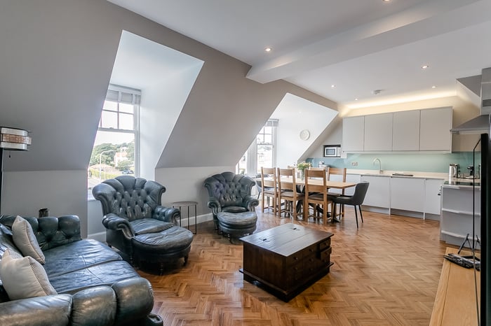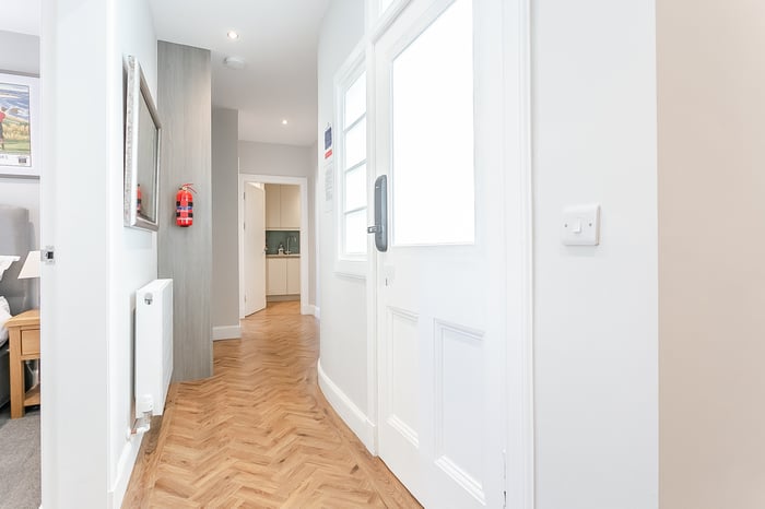 A welcoming entrance provides access to all rooms, leading into the spacious open-plan living and dining area, with the kitchen positioned at the rear. The room features continuous Karndean flooring and an abundance of natural light, creating a bright and inviting atmosphere.