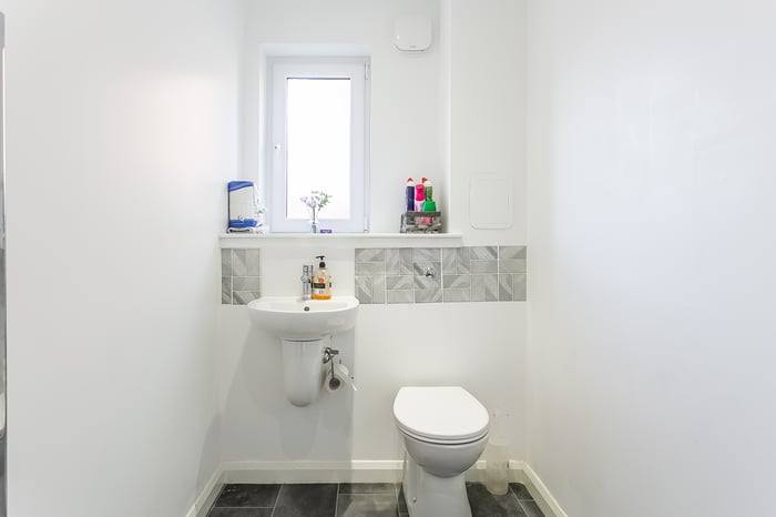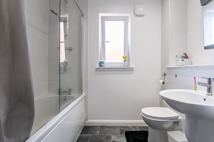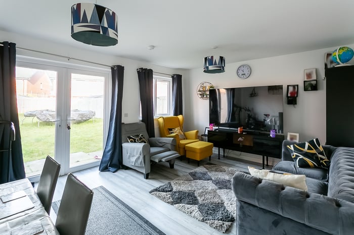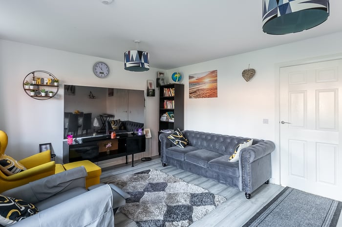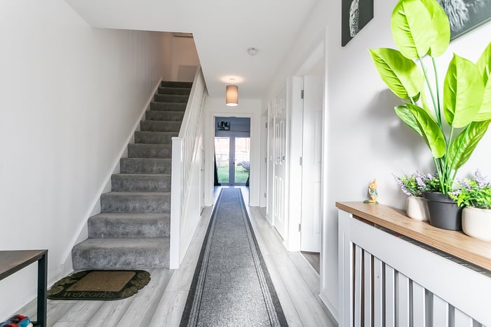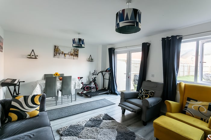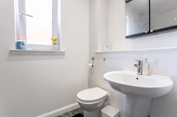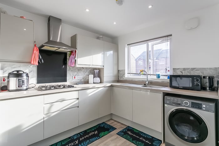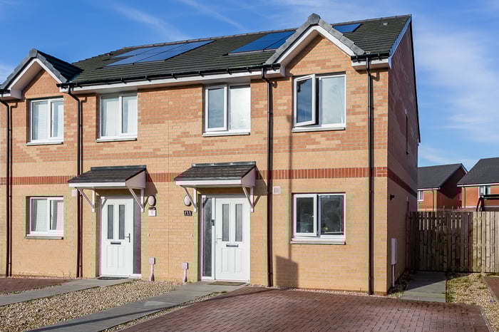 Light and tastefully presented, three-bedroom, modern semi-detached home, with gardens and a driveway. Located in a quiet residential street, in the popular Barmulloch area, northeast of Glasgow city centre. A welcoming entrance hall has space for outerwear and affords access throughout the ground floor, including two convenient storage cupboards and a modern WC. Set to the rear, with wood effect flooring continuing from the hall, a spacious living room has space for a dining area, two light fittings, and patio doors leading to the garden.