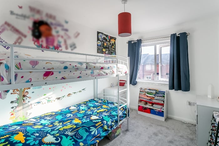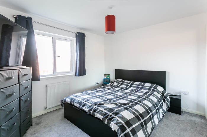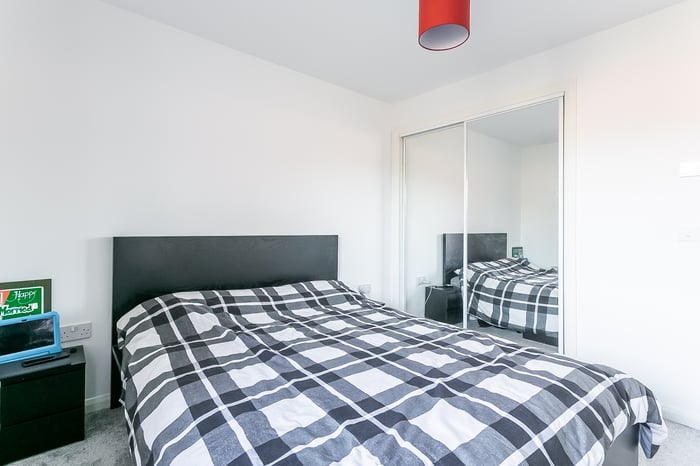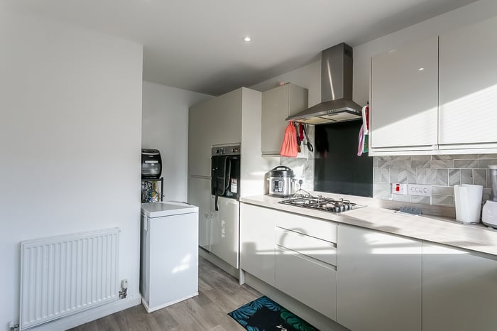 To the front, a stylish kitchen is fitted with modern units and worktops, a sink with a drainer; and an integrated oven, gas hob, dishwasher and fridge/freezer. On the upper floor, the master bedroom is set to the rear, with light decor, carpeted flooring, a light pendant, a built-in mirrored wardrobe, and a generous en-suite shower room.