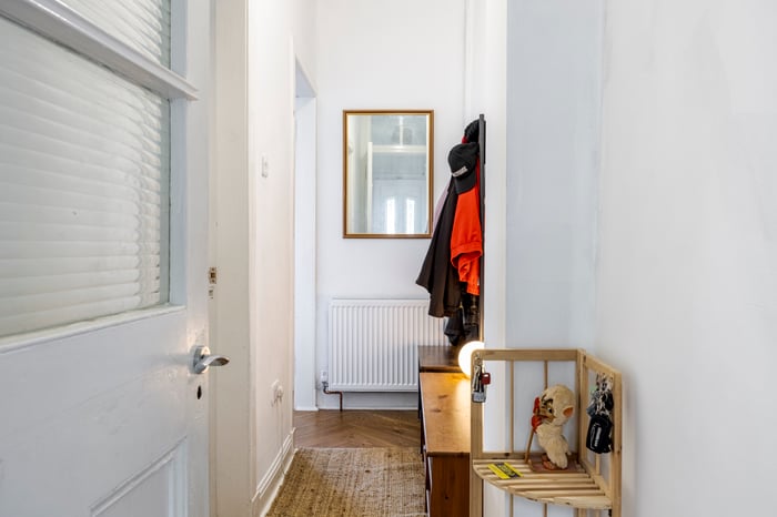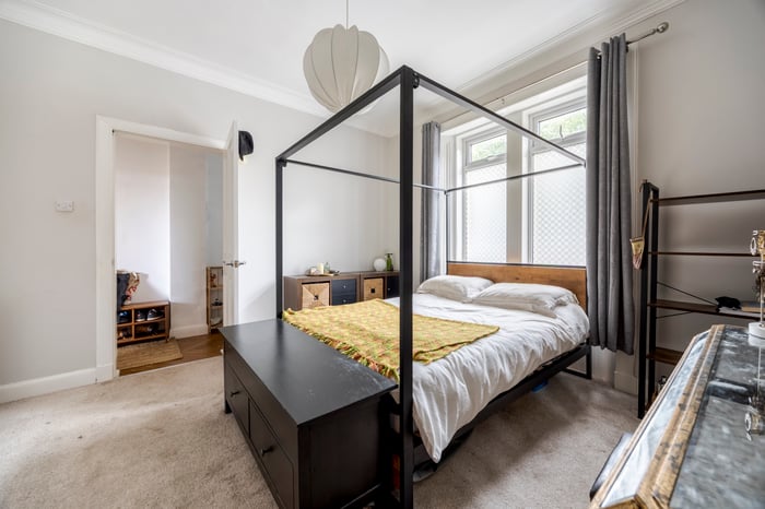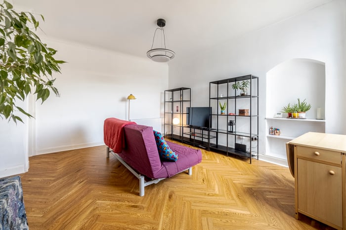 Set quietly back from the street, this welcoming home opens into a master bedroom with soft carpeted flooring and space for standalone furniture. The bright living room features wood-effect flooring, light décor, and a large window for plenty of natural light.
