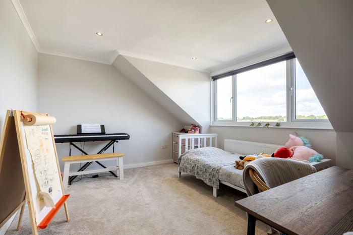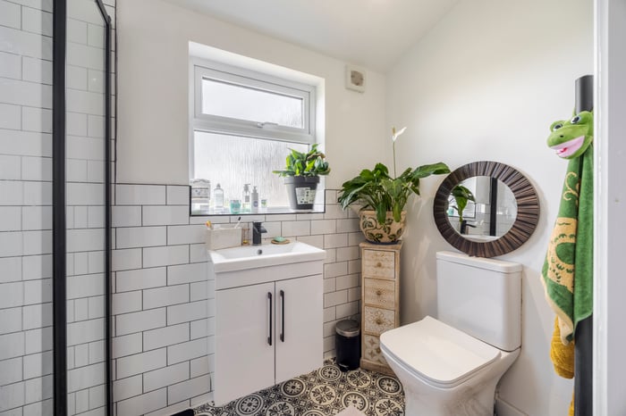 Upstairs, two carpeted bedrooms enjoy neutral décor and natural light, while the family bathroom includes a three-piece suite with a shower over bath and a matching ladder-style radiator.