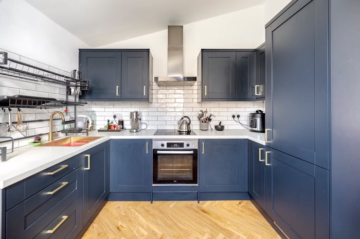 The modern kitchen includes sleek countertops, a tiled splashback, an integrated oven and electric hob with a canopy, and a sink with a drainer. A separate utility room offers space for one appliance and leads to a timber-decked area, with an adjacent shower room featuring a three-piece suite, tiled walls, and a ladder-style radiator.