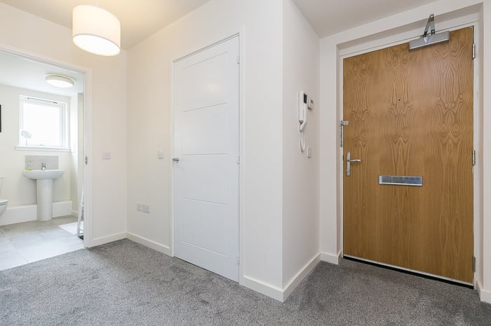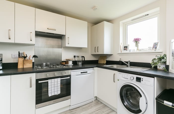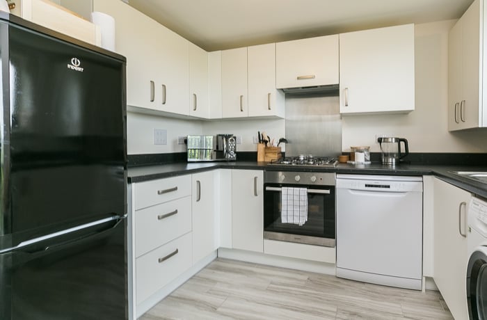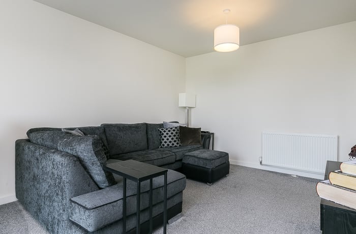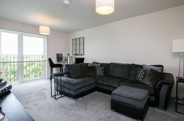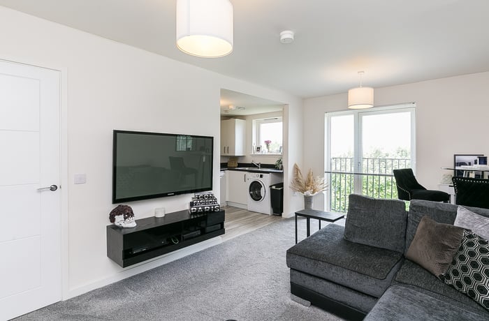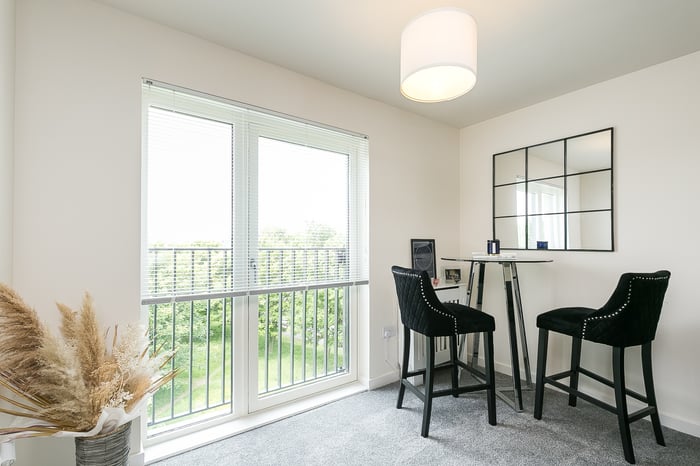 The open-plan living space has ample room for lounge and dining furniture, two pendant light fittings, carpeted flooring, and a Juliet balcony taking in the northward views. The stylish kitchen features contemporary stone-effect worktops with a matching upstand, sink with drainer, and an integrated oven and gas hob with stainless steel splashback.