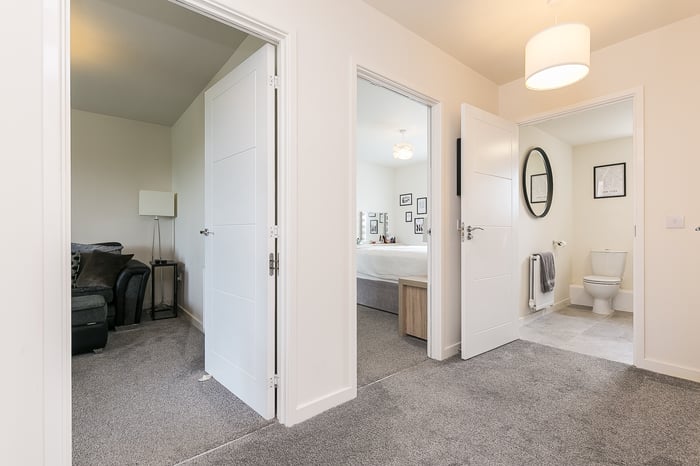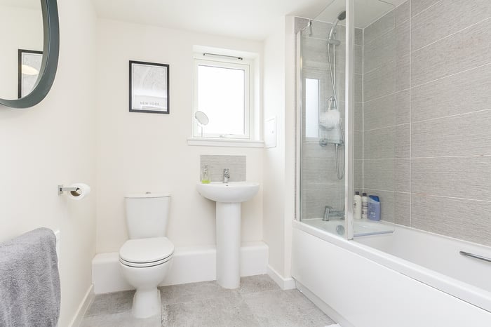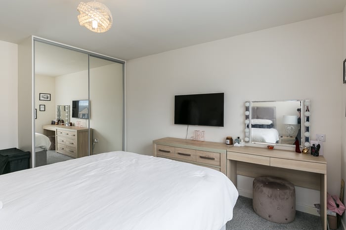 The carpeted double bedroom features a built-in wardrobe, wall-mount TV point, and a pendant light fitting. A family-size bathroom is fitted with a modern suite, including a mains shower over the bath, and tiled splash walls.