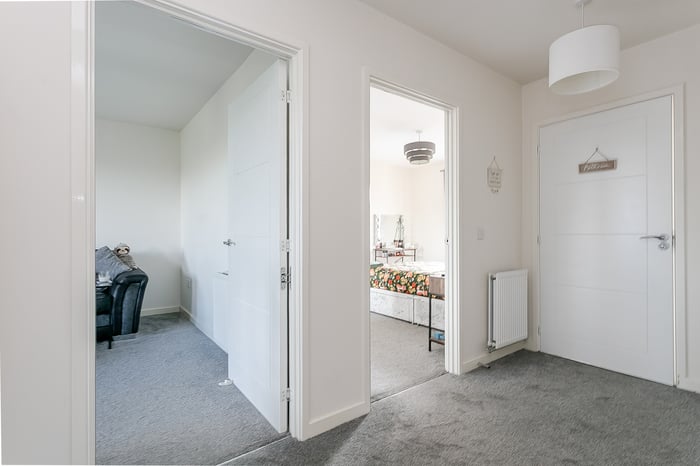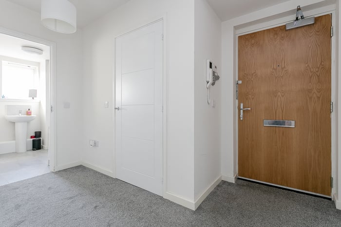 A welcoming entrance with carpeted flooring provides access throughout the property and includes two built-in cupboards along with a secure entry handset. From here, you are led into the open-plan living and dining area, where the kitchen is neatly set to the side.