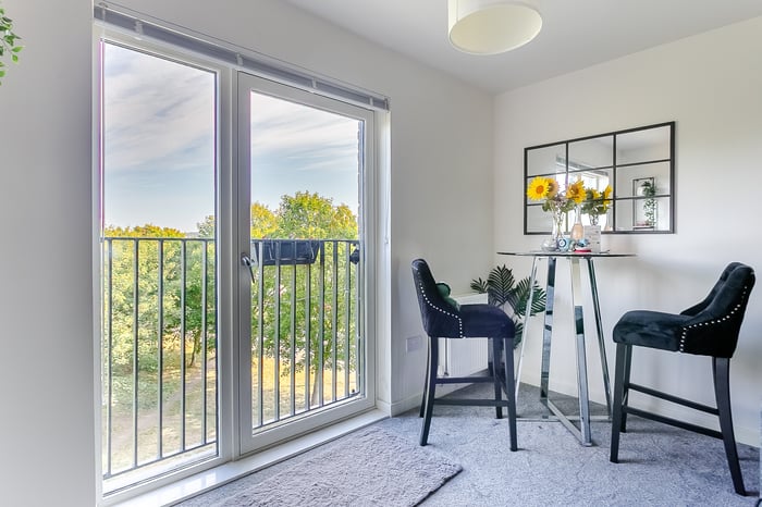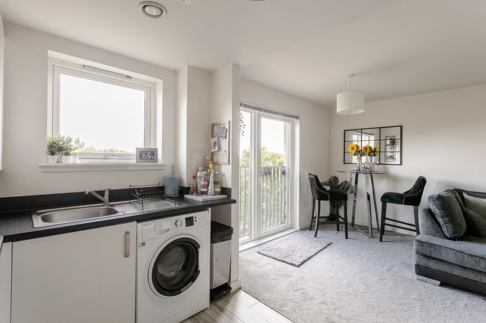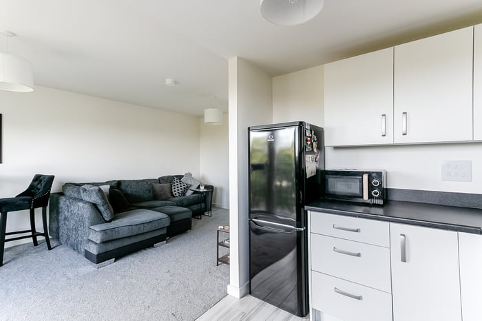 The living space continues the carpeted flooring from the hallway and benefits from a Juliet balcony, perfect for relaxing or entertaining. The kitchen is finished with wood-effect flooring, complemented by granite-effect countertops and matching upstands, and comes fully fitted with a stainless steel sink and drainer, integrated oven with gas hob and canopy, washing machine, dishwasher, and fridge/freezer.