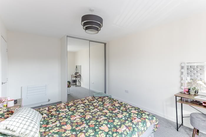 The bedroom also enjoys carpeted flooring and a built-in cupboard for additional storage, while its light décor and Juliet balcony enhance the sense of space. Completing the property is a modern family bathroom, fitted with a three-piece suite including a shower over the bath and tiled splash walls.