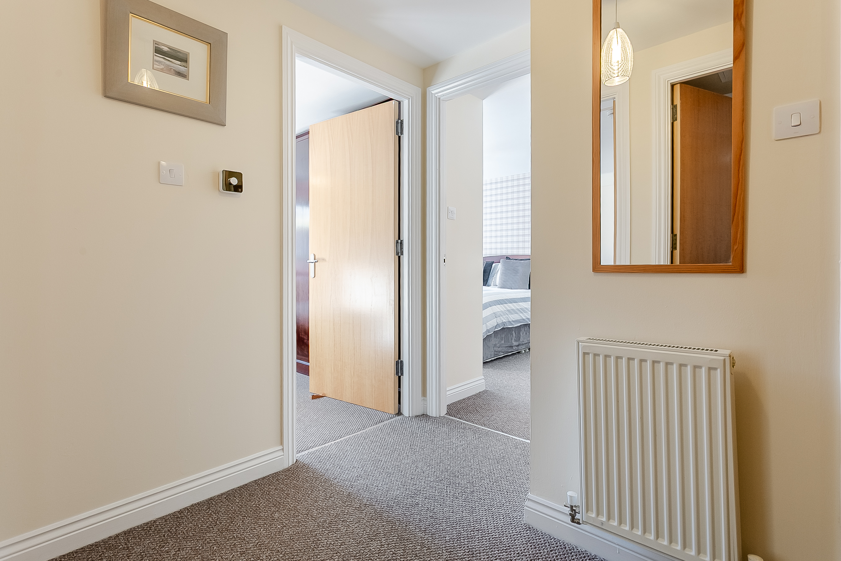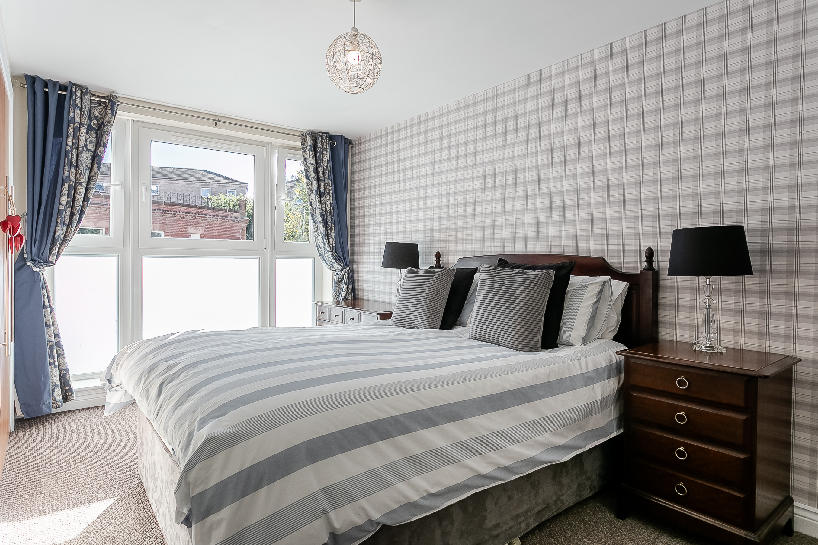 The master bedroom boasts a built-in wardrobe, carpeted flooring, and a contemporary en-suite shower room with an electric shower. A second double bedroom, also with a built-in wardrobe and carpeted flooring, offers flexible space ideal for guests, family, or home working.