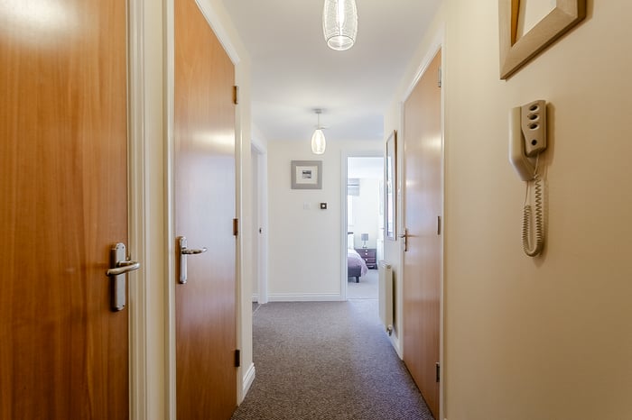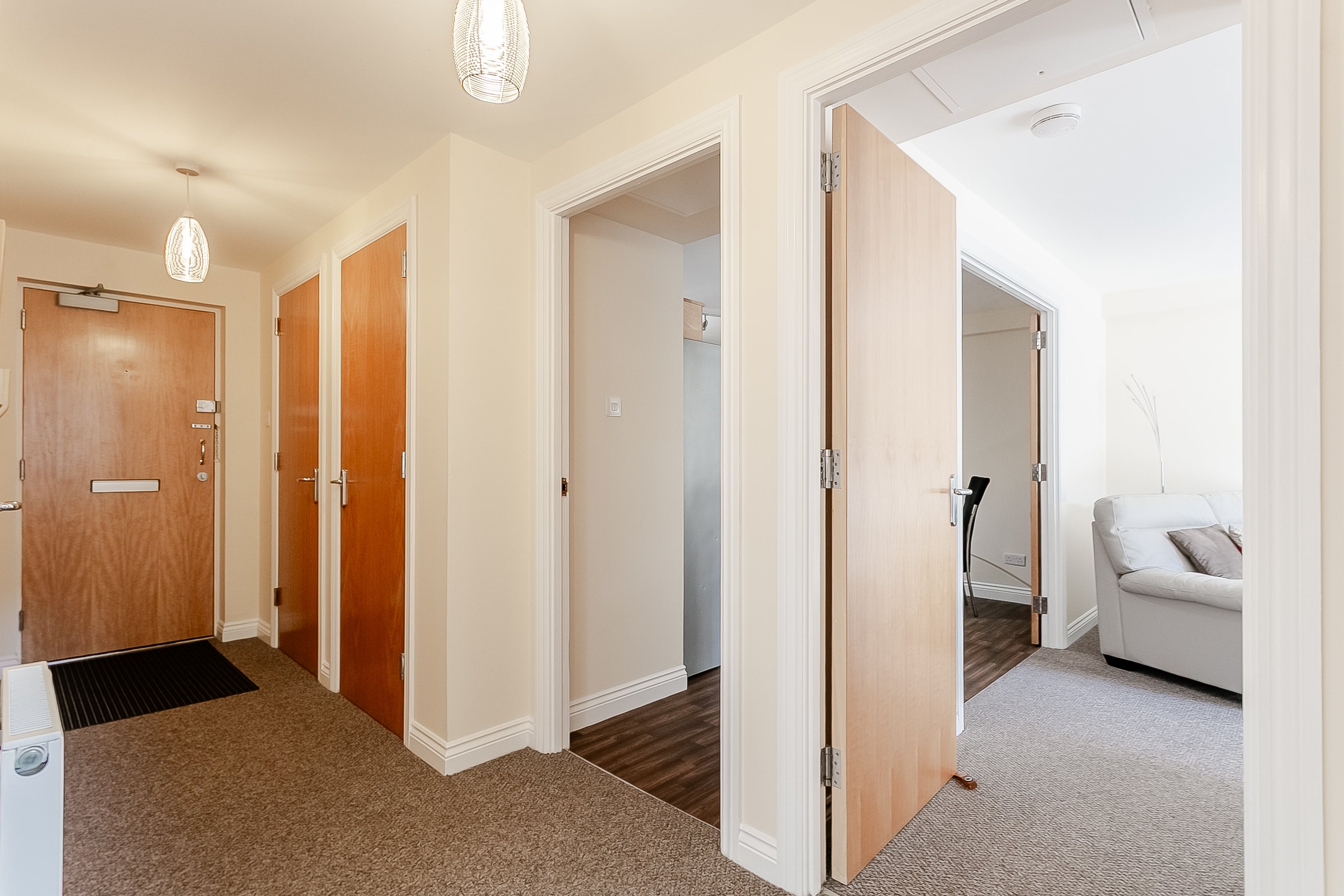 A welcoming entrance hall has two storage cupboards and an entry phone handset. A generous living room is bright and inviting, featuring carpeted flooring and access to a private balcony via patio doors—perfect for relaxing or entertaining.