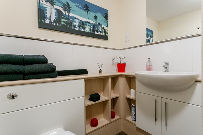Completing the accommodation, the main bathroom features a modern white three-piece suite with an over-bath mixer shower, tiled splash areas, and useful storage units.