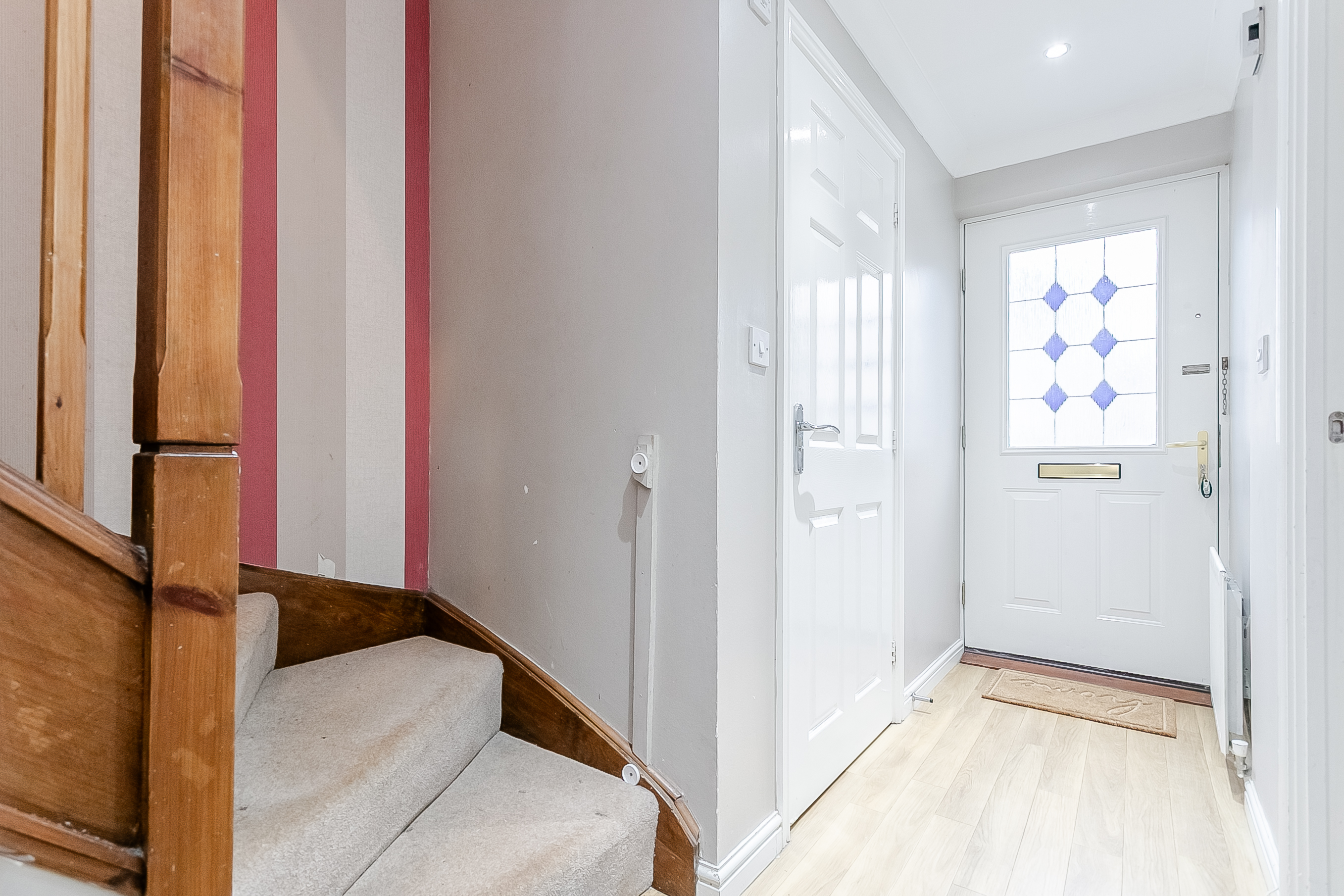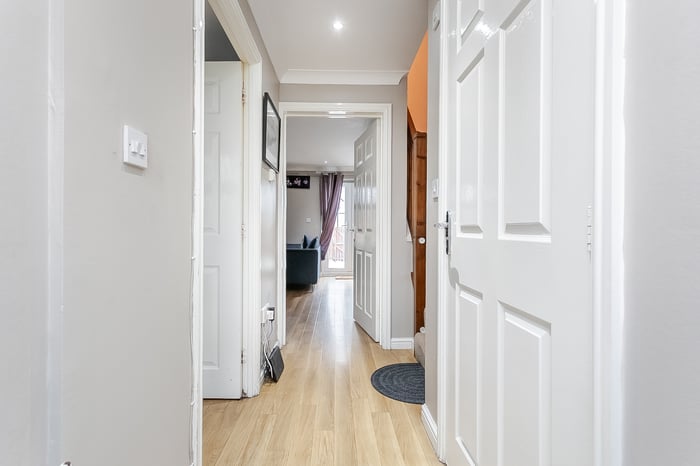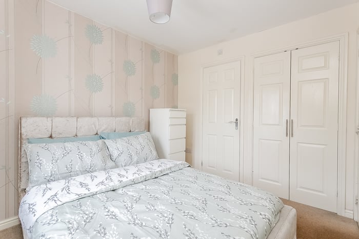 The entrance hall also benefits from a convenient ground-floor WC. Heading upstairs, the carpeted landing provides access to all three bedrooms, each finished with matching carpet throughout; bedrooms two and three benefit from light décor, while bedroom one features a built-in cupboard ideal for storage and an en-suite shower room comprising a three-piece suite with a standalone shower cubicle.