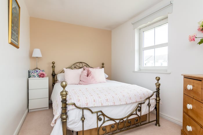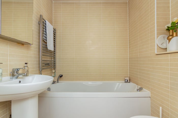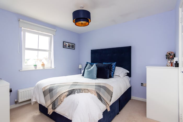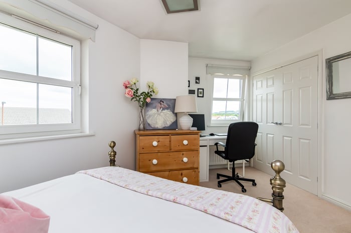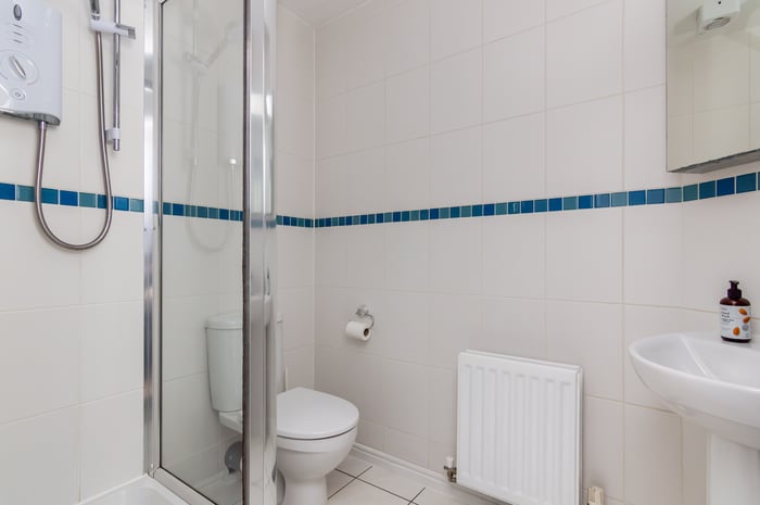 The southerly facing master bedroom features carpeted flooring, a built-in wardrobe and an en-suite shower room with a modern two-piece suite, an electric shower and tiled splash walls; whilst bedroom two is set to the opposite aspect, similarly well finished, with carpeted flooring and a built-in wardrobe. Completing the accommodation, the fully tiled bathroom is fitted with a modern three-piece suite, modern floor to ceiling tiles and a ladder-style radiator.