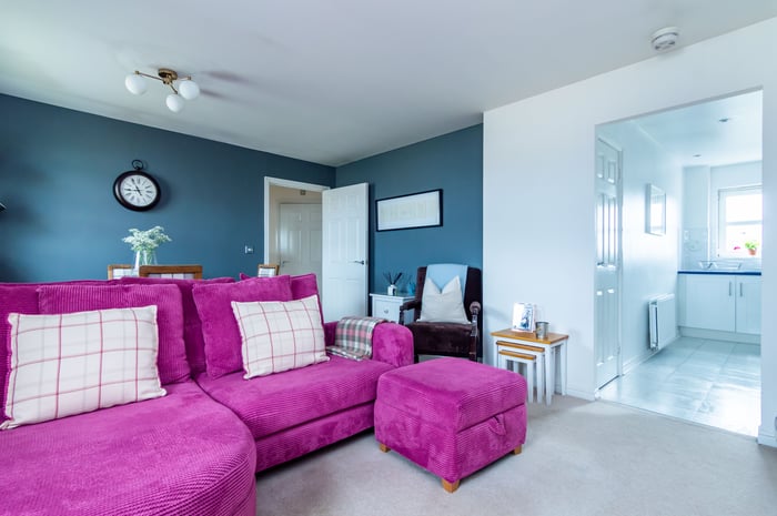 The entrance hall serves each room of the property, has a secure entry phone, a storage cupboard and carpeted flooring. Set to the front, the spacious living/dining room features dual aspect windows, carpeted flooring, and central light fixitures and has space for both lounge and dining furniture.