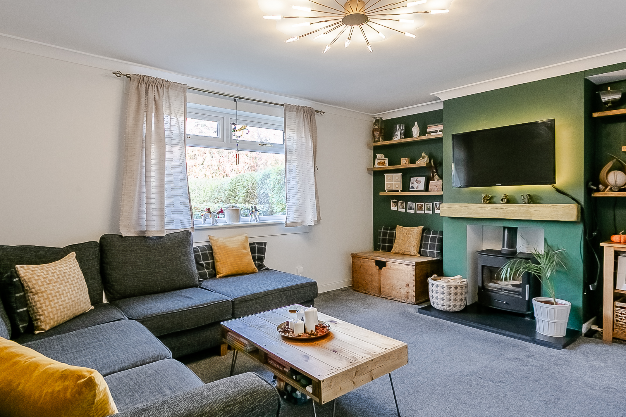 The welcoming entrance hall provides access to all ground-floor rooms and includes generous storage space, making it both practical and inviting. The spacious living room is the heart of the home, offering soft carpeted flooring, a charming log burner that creates a warm focal point, and a wall-mounted TV point for convenience.
