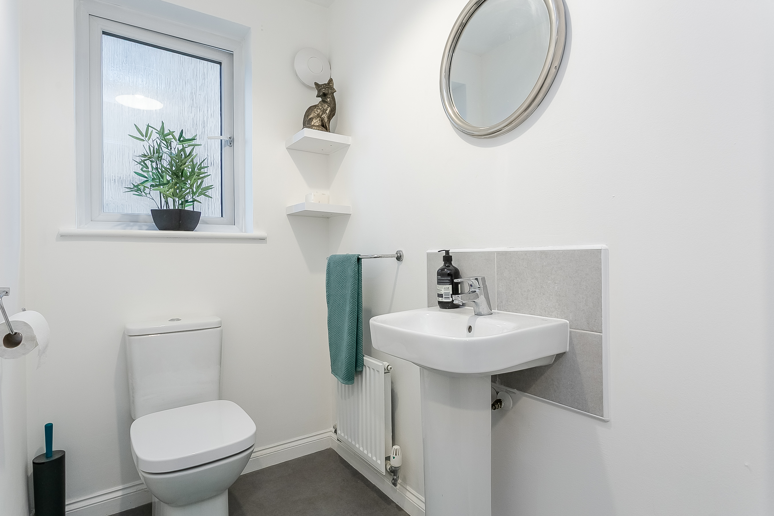 Integrated appliances include a fridge/freezer, washing machine, oven and electric hob with a canopy extractor above, offering a practical and contemporary cooking space. A conveniently placed ground-floor WC sits opposite a built-in storage cupboard, adding further functionality.