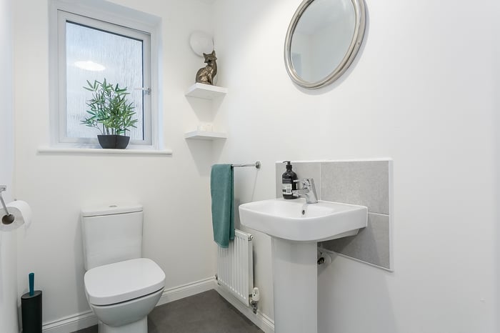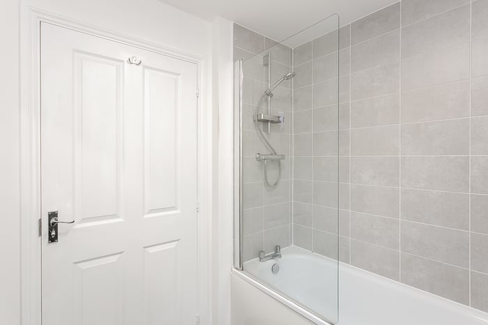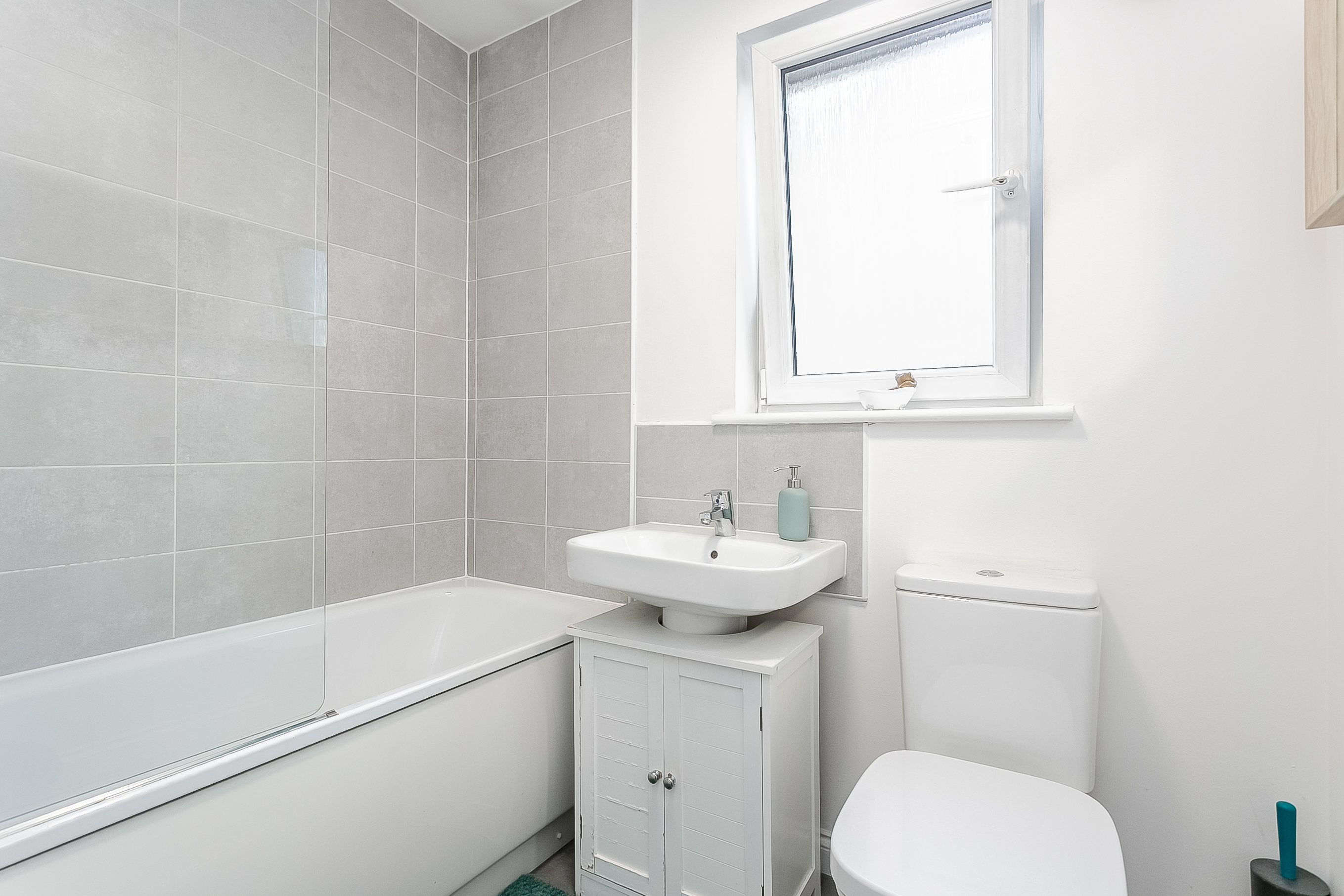Completing the accommodation is the modern three-piece family bathroom, fitted with stone-effect flooring, a tiled splashback surround, central light fitting and a shower over the bath, creating a sleek and contemporary finish throughout.
