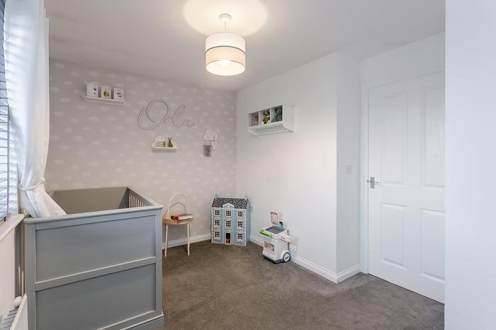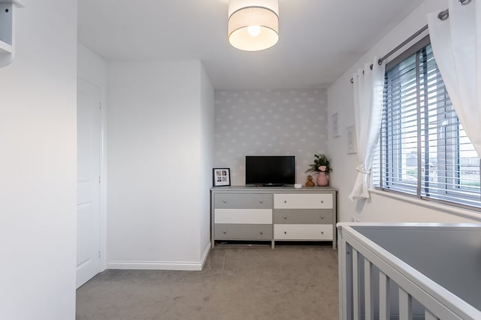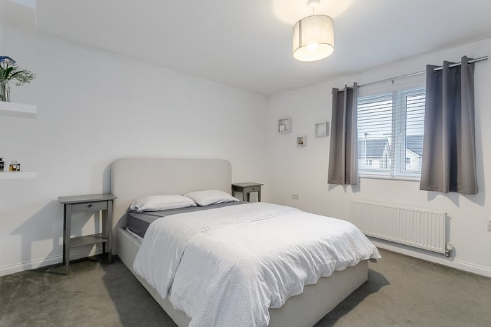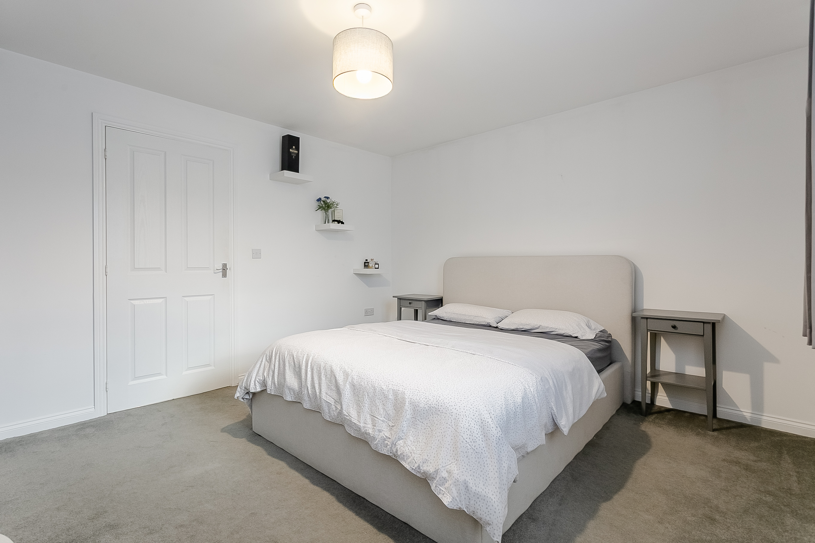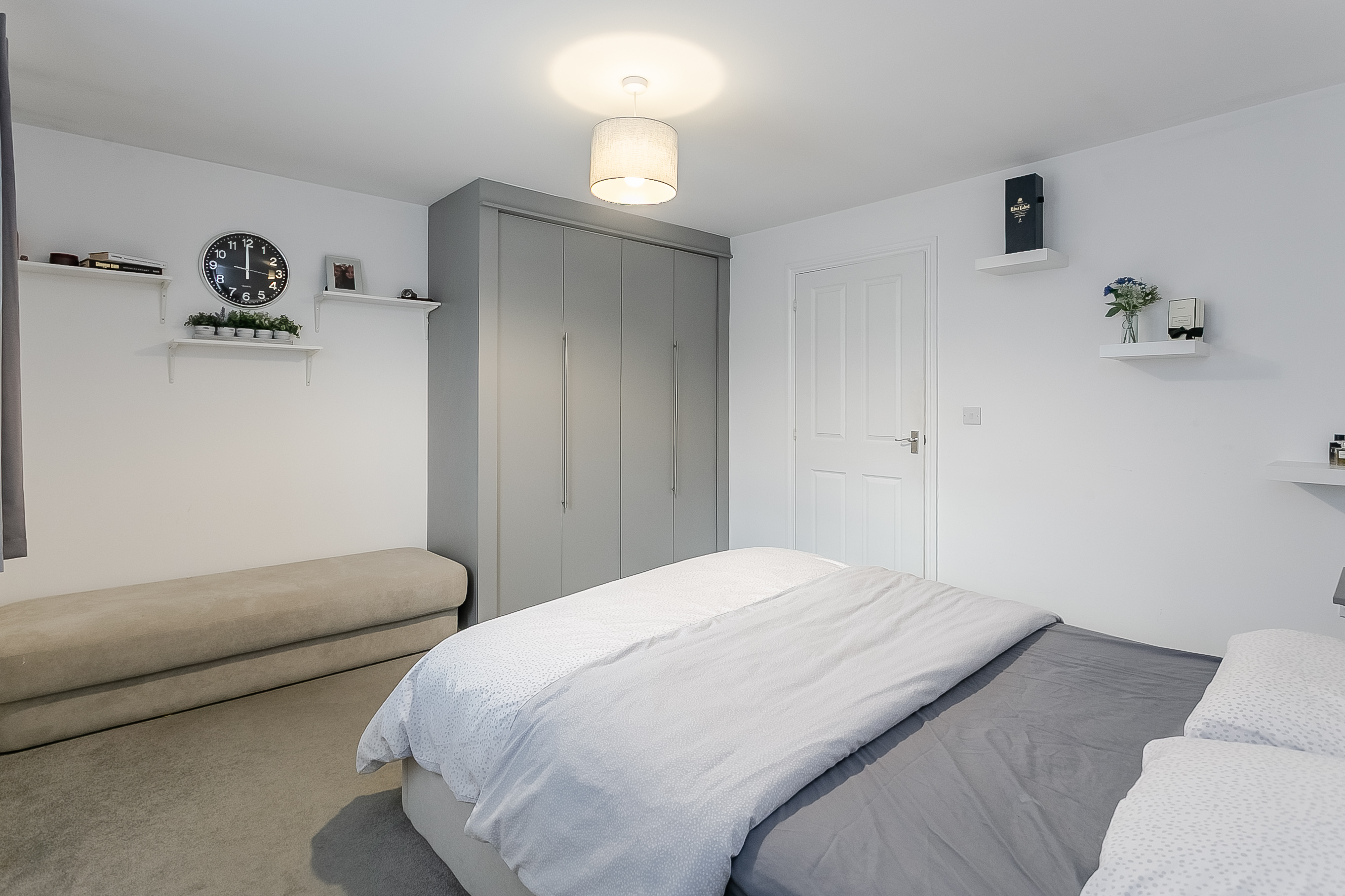 On the first floor, bedroom one is a spacious double room, featuring soft carpeted flooring and a built-in wardrobe with bi-fold doors, providing ample storage while maintaining a clean and uncluttered feel. Across the hall, the second bedroom is another generously sized room, also carpeted, and offers versatility as a guest room, home office or additional bedroom.