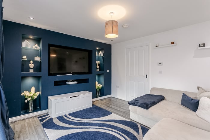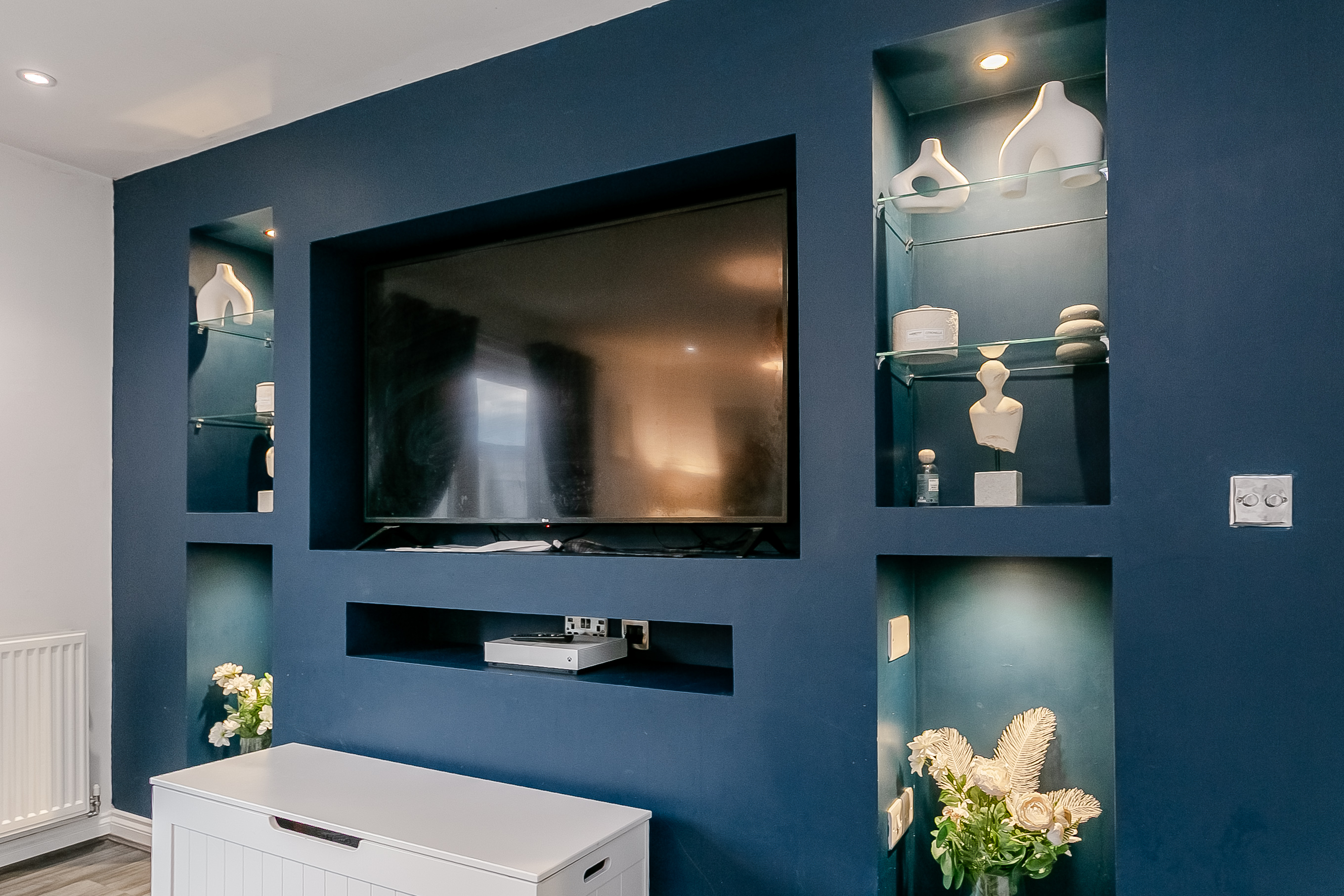 The tiled entrance hall offers a welcoming first impression and provides access to all ground-floor rooms, with the staircase positioned directly ahead. To the rear of the property, the living room is a bright and well-proportioned space, enhanced by wood-effect flooring, a combination of central and spotlighting, and a bespoke media wall creating a stylish focal point.
