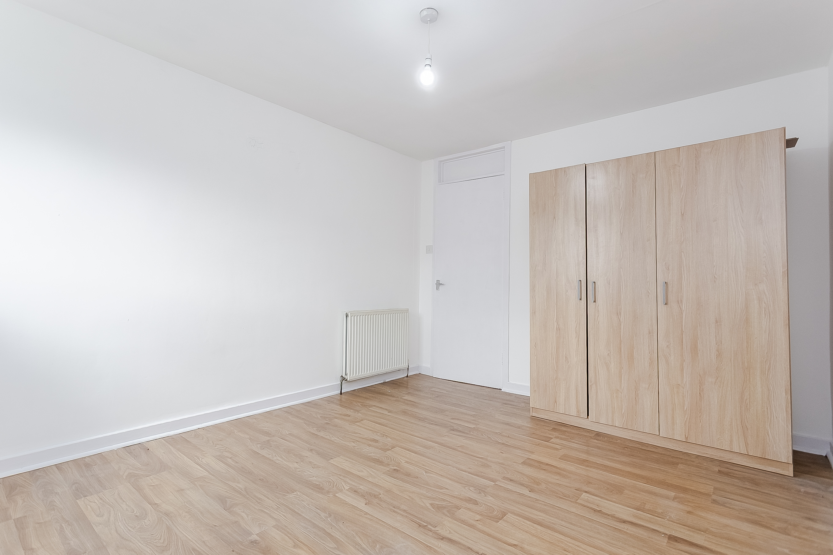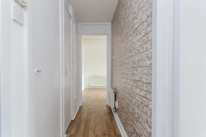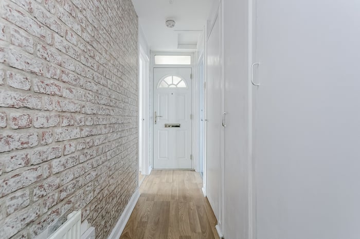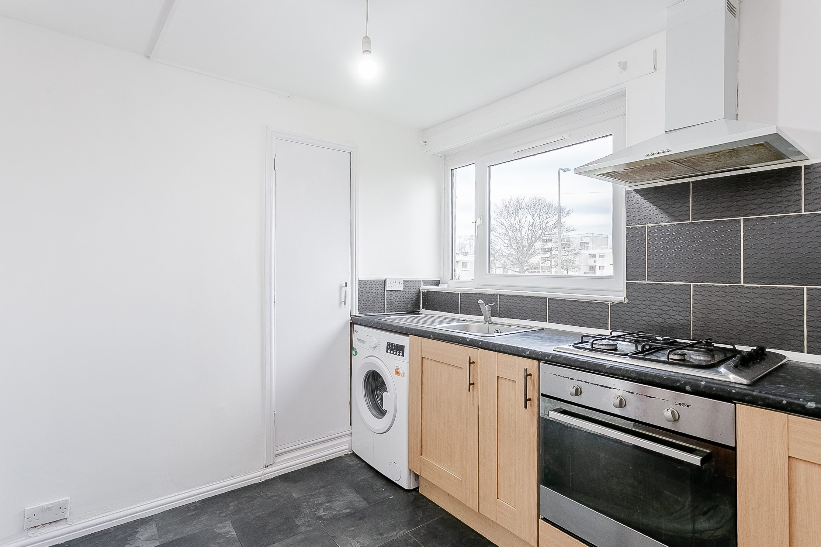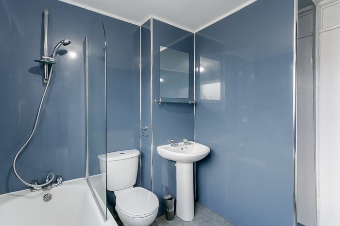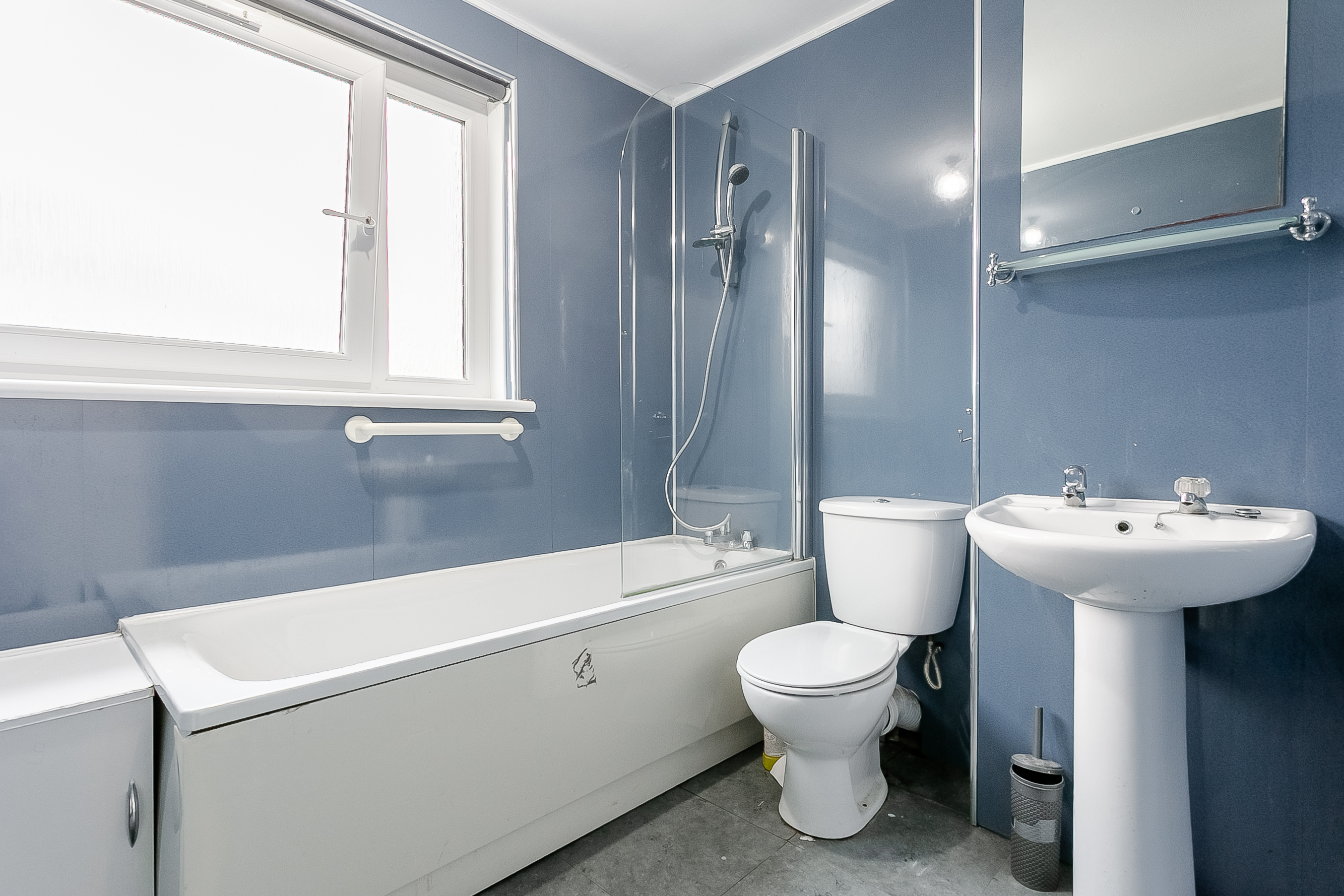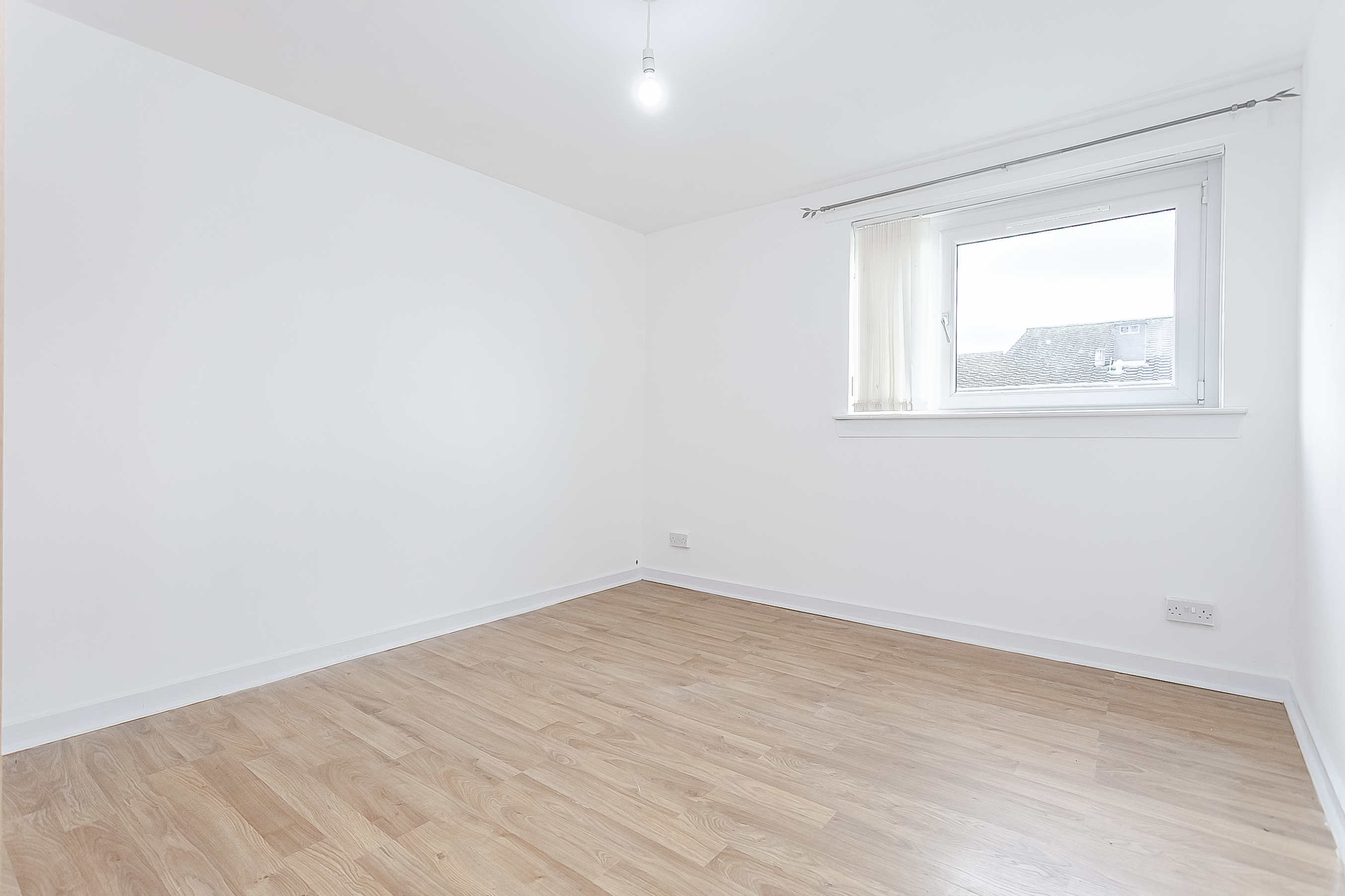 To the front of the property, the bedroom continues the contemporary flooring from the hallway and enjoys a large window that allows for plenty of natural light. Opposite the bedroom is the bathroom, which comprises a three-piece suite with a shower over the bath.