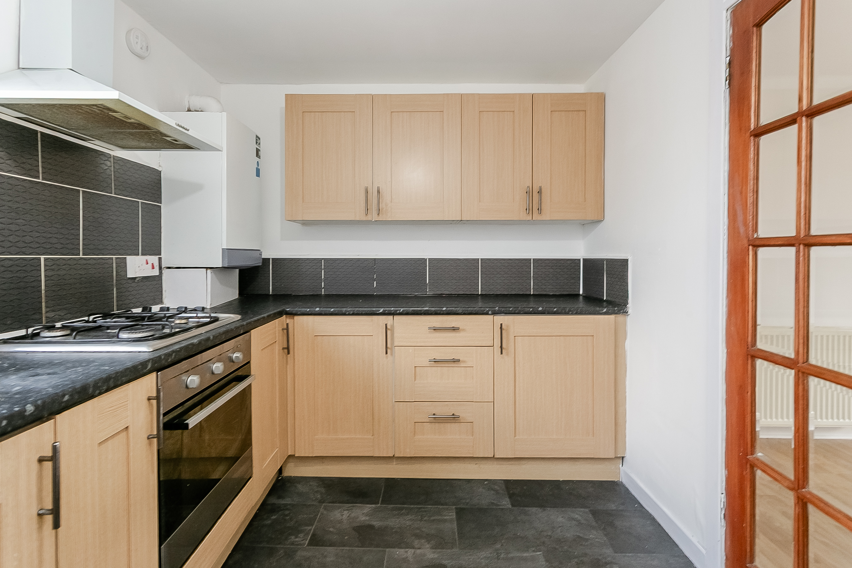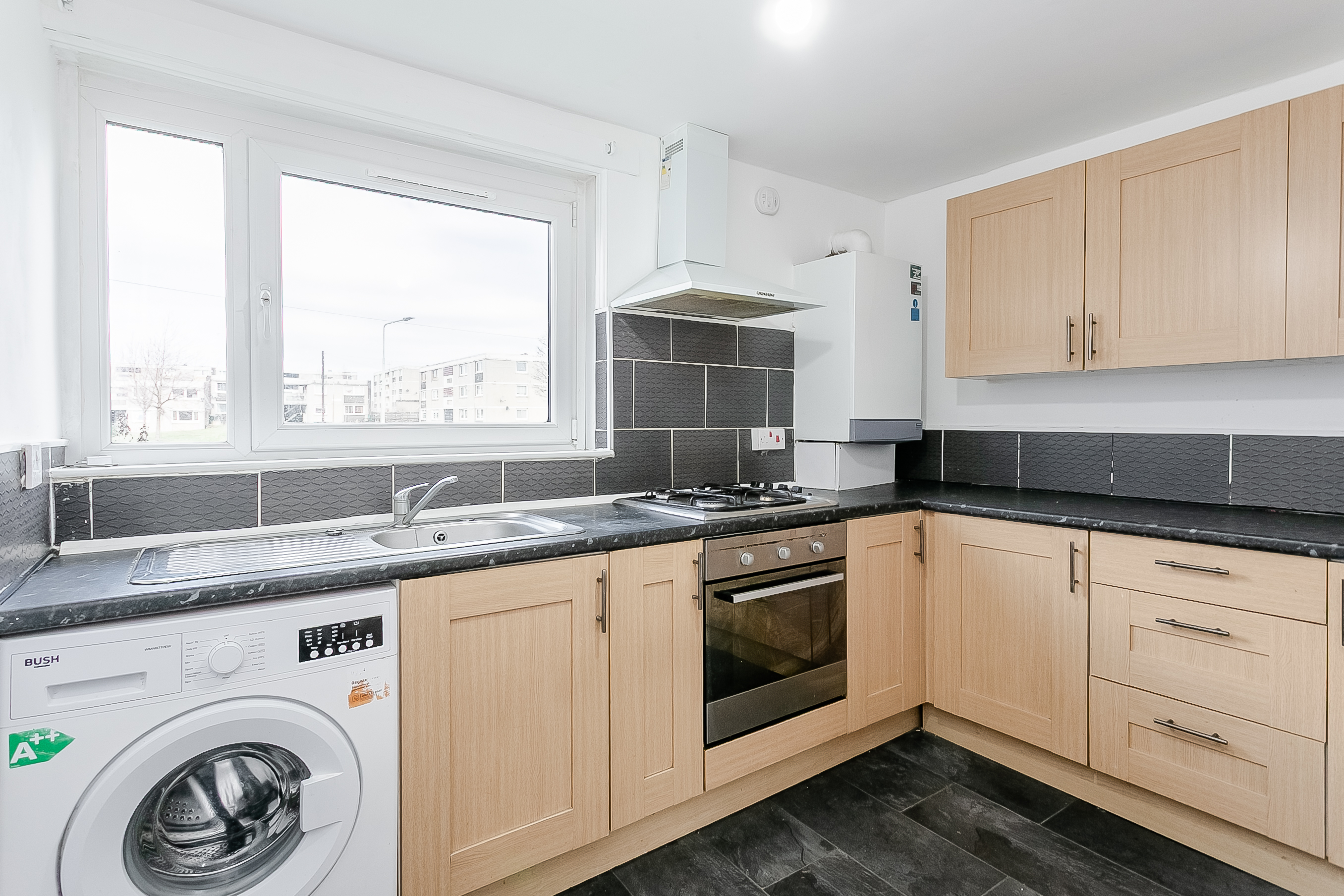 The living and dining room is positioned to the rear of the property and features contemporary flooring throughout, complemented by light décor, and offers direct access to the kitchen. The kitchen is finished with granite-effect worktops, a stylish splashback, a stainless steel sink with a drainer, an integrated oven, a gas hob with a canopy above, and a washing machine.
