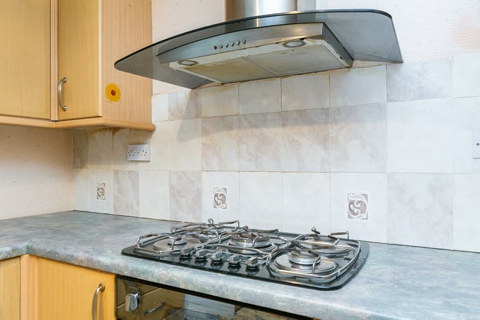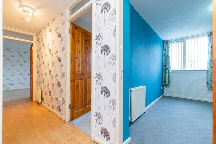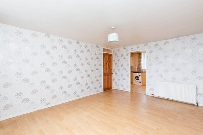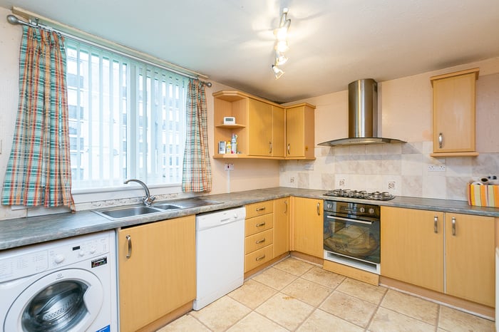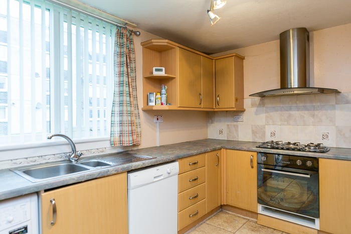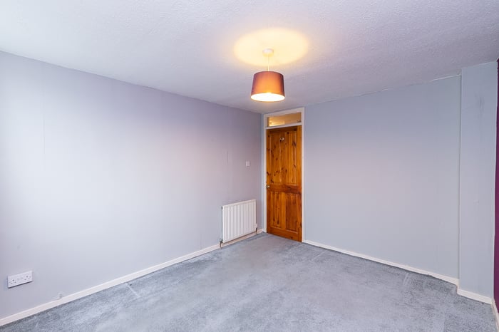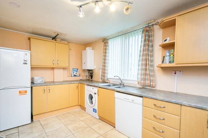 Set off the lounge, the kitchen has a rear-facing window, and features ample fitted units and worktops, sink with drainer and an integrated oven and 5 ring gas hob with canopy above. Two carpeted double bedrooms are set to the front with central pendant light fitting and ample space for freestanding storage.