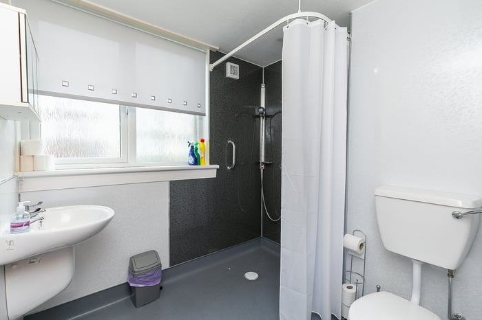 With a rear-facing window, the generously sized, wet room style shower room has a two-piece suite, and a mains shower.