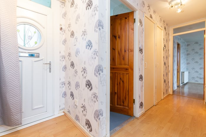 The hall gives access to all rooms except the kitchen and includes two built-in store cupboards, and access to the walk-in store room with lighting. Front-facing, a good-sized public room includes wood-effect flooring and a pendant light fitting.