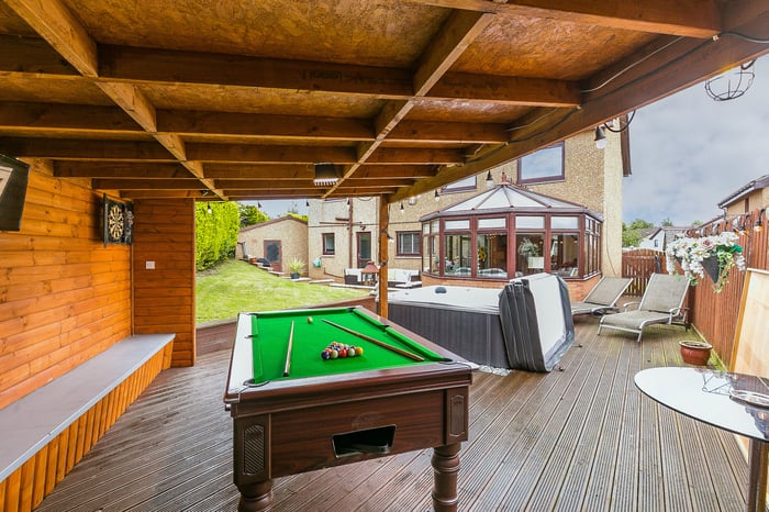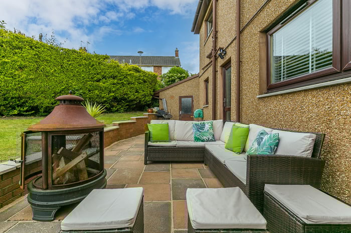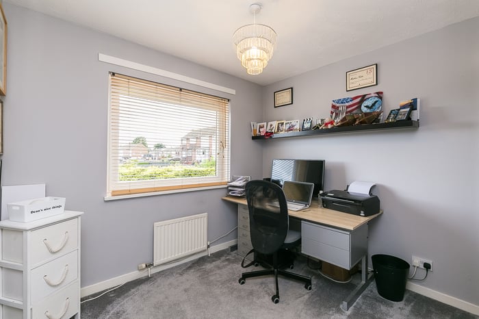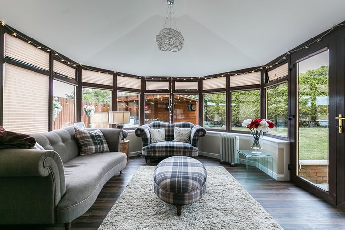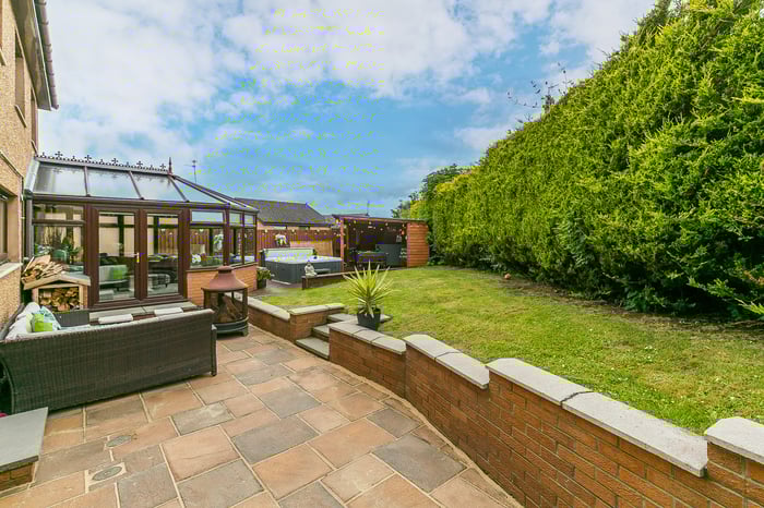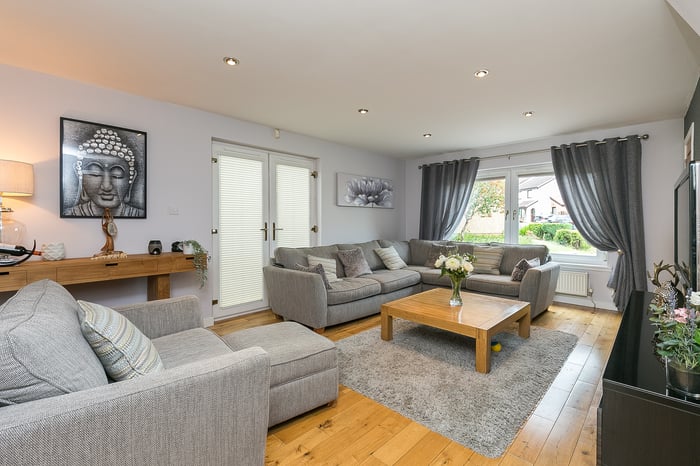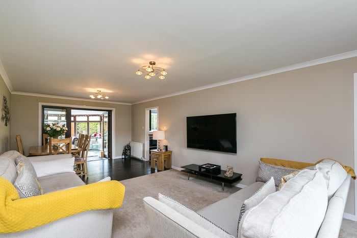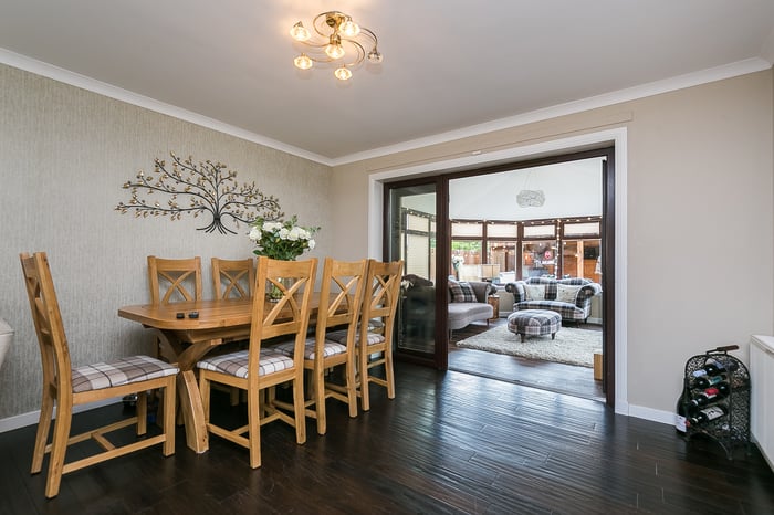 A glazed porch offers exceptional space for outerwear and opens to the main reception hall featuring quality oak wood flooring and ample space for freestanding furniture. With a front-facing window, the first public room features a carpeted lounge area with a TV wall-mount and a dining area with access to both the kitchen and a particularly generous conservatory.
