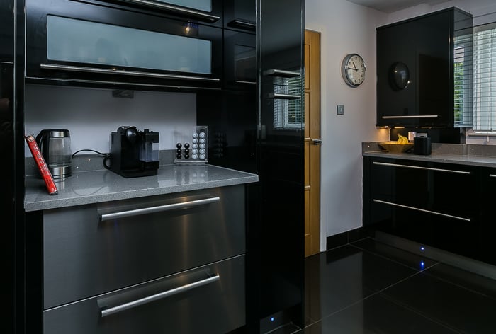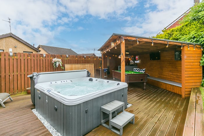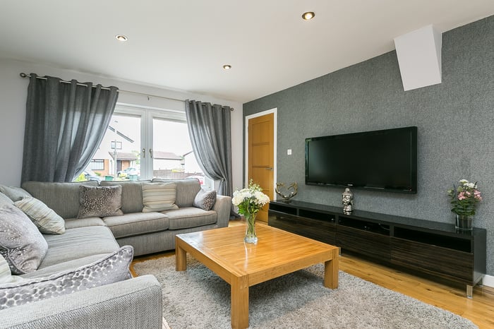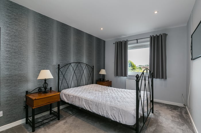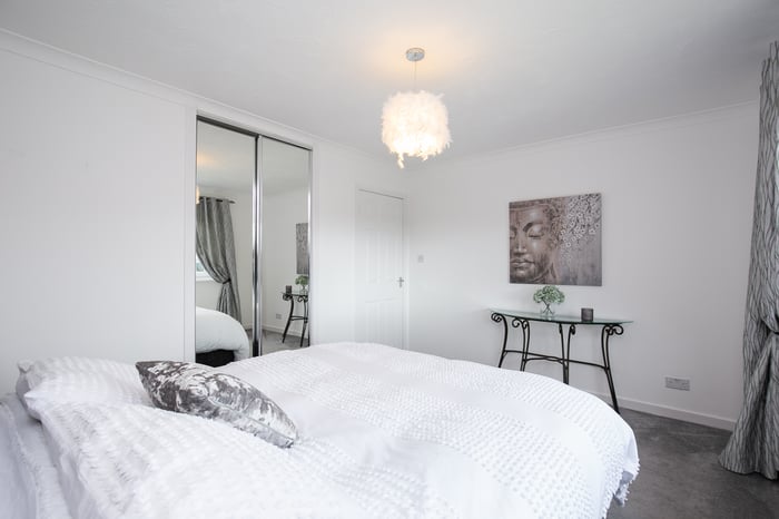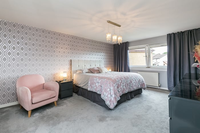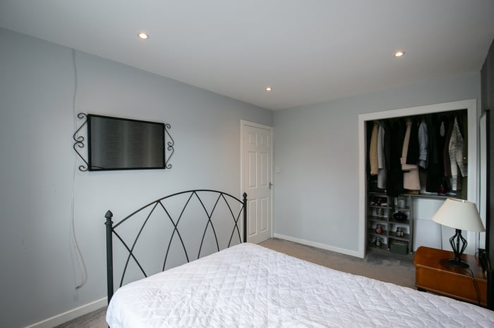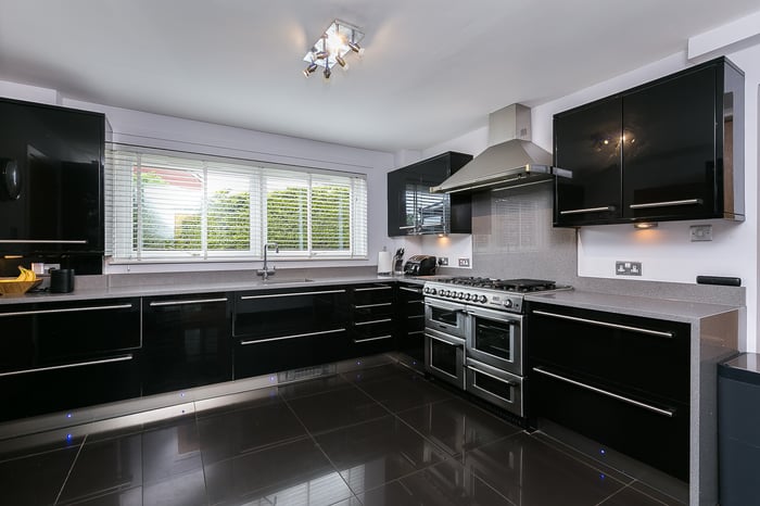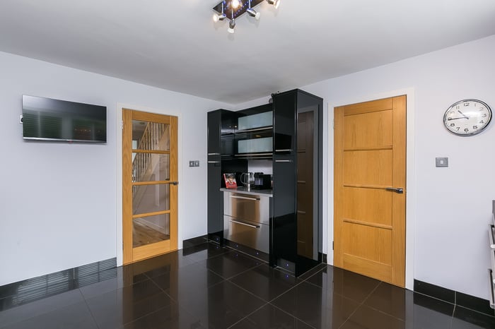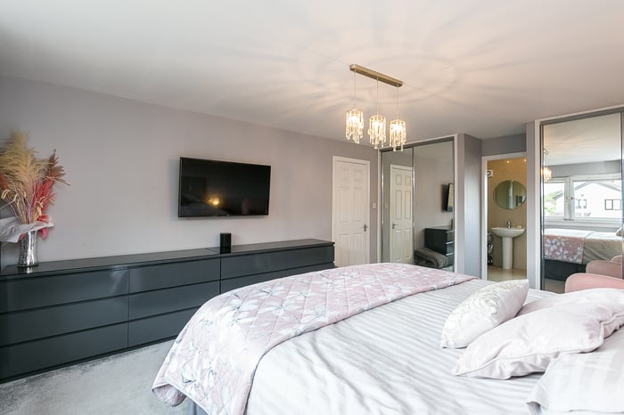 On the first floor, a carpeted master bedroom is front-facing and includes two built-in mirrored wardrobes, a TV wall-mount and a spacious en-suite bathroom with a separate shower cubicle. Four further bedrooms make up the family accommodation and all feature built-in storage.