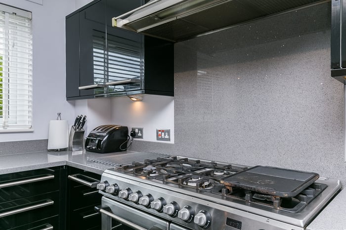 The kitchen has triple access to the dining room, hall and the sitting room, whilst fitted units include granite worktops with matching upstands and an inset sink, an instant boiling water tap, a range cooker, and an integrated dishwasher. A dual-aspect sitting room includes solid oak wood flooring continued from the hall, a TV wall-mount, and side aspect French patio doors.