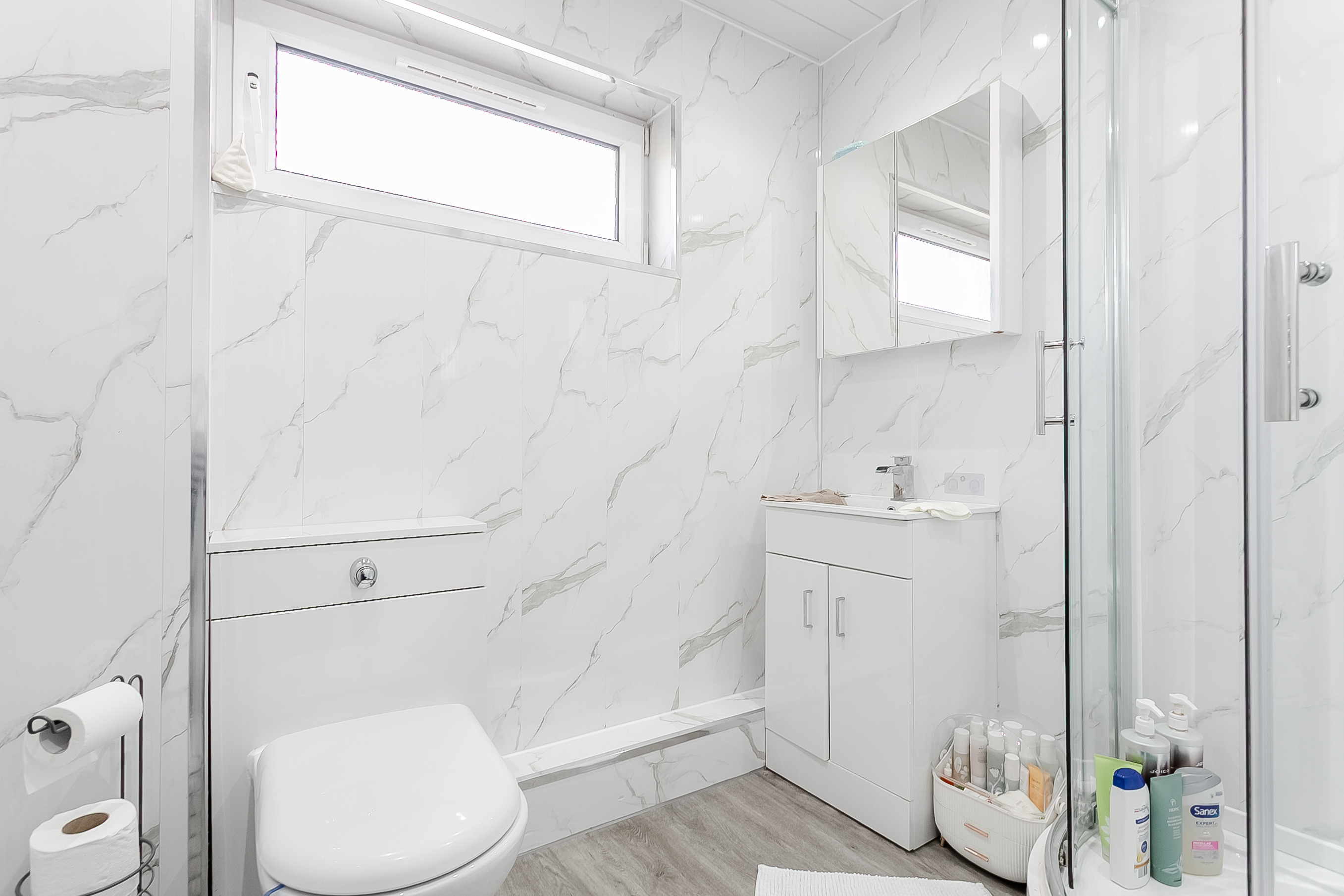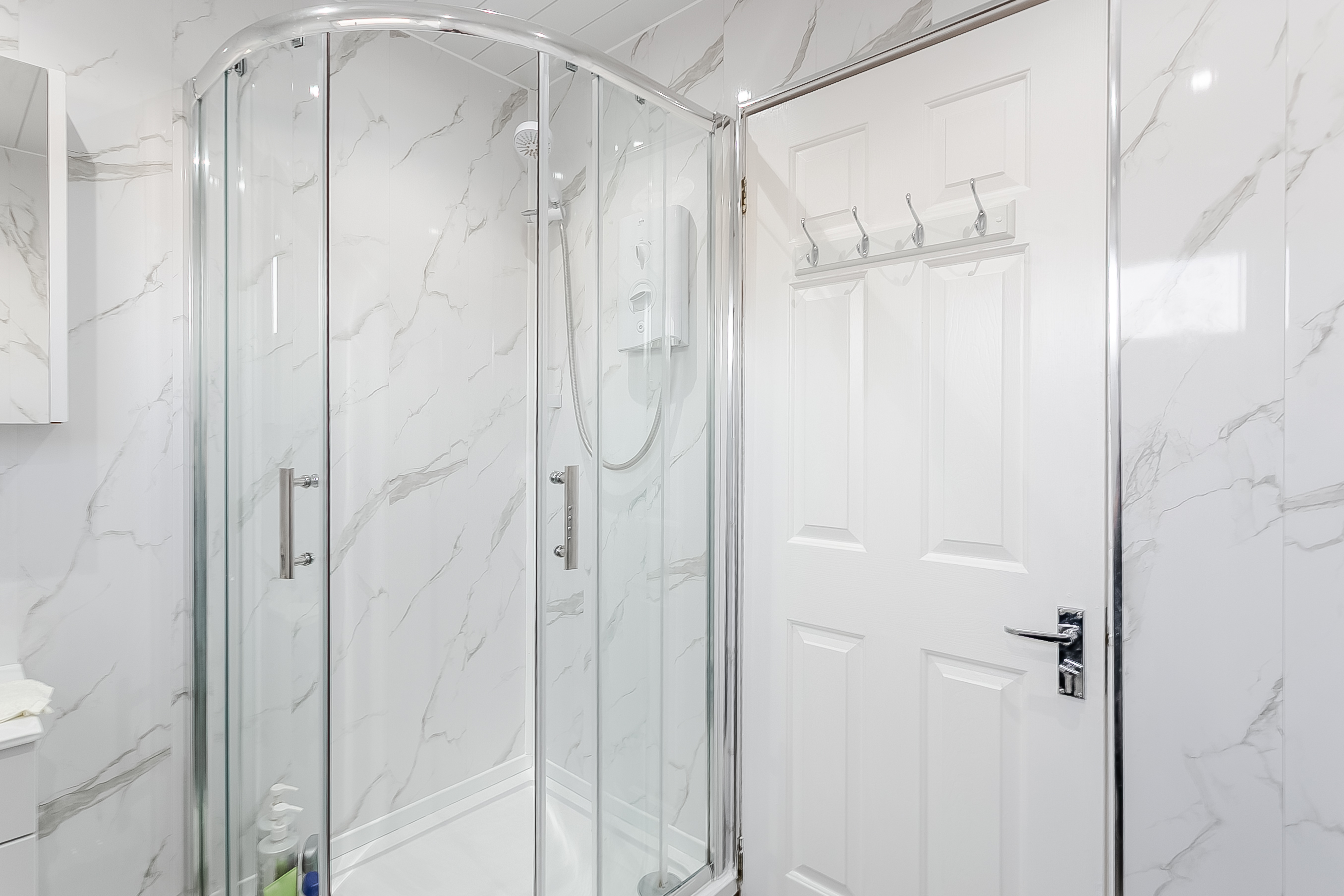 Completing the interior, the modern fitted shower room features wood effect flooring, a marble effect splashback surround, spotlighting and a ladder style radiator.