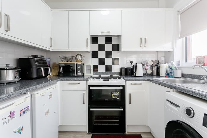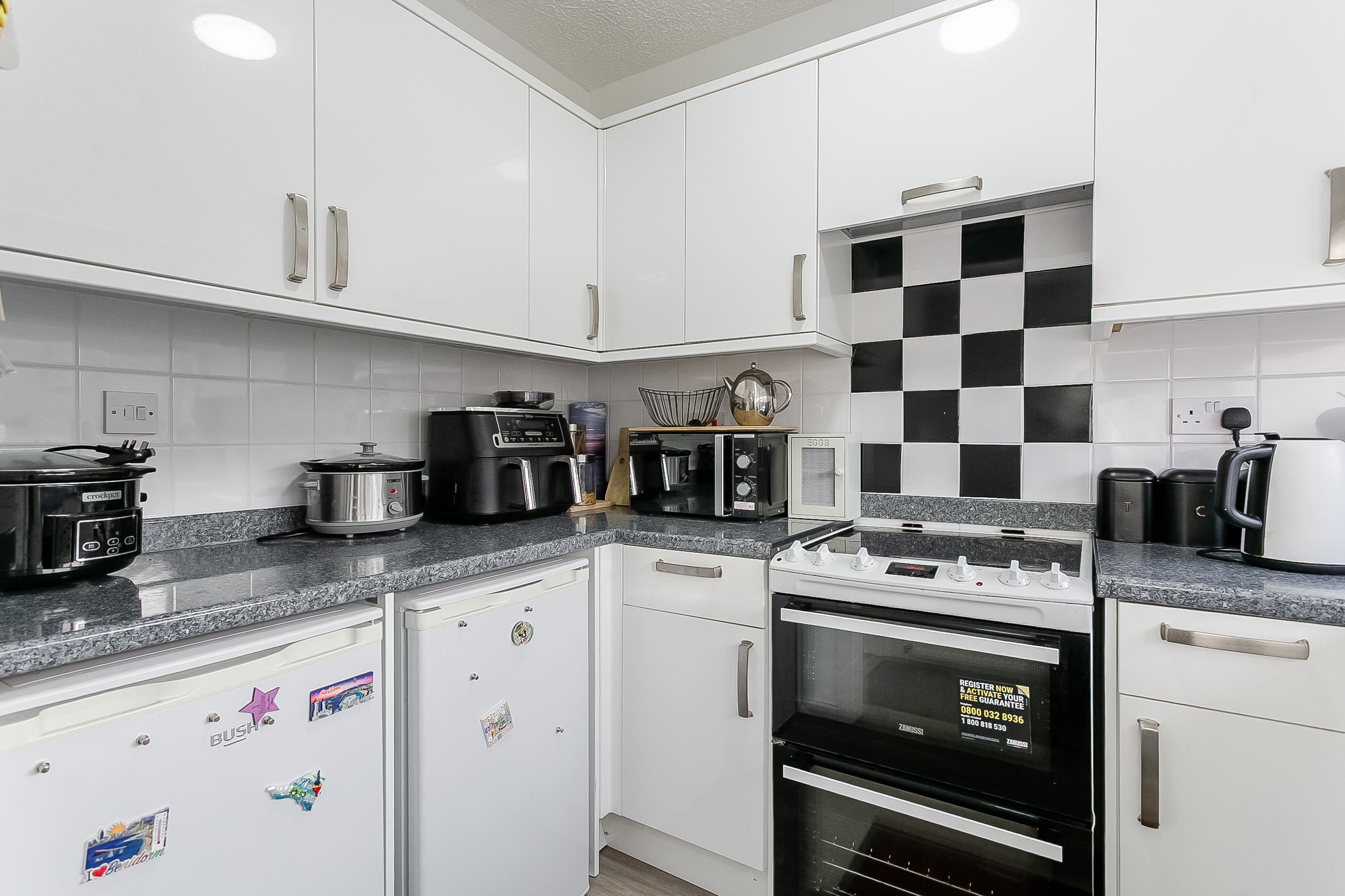 At the front of the property, the fitted kitchen is well arranged and practical, with wood-effect flooring, stone-effect worktops and a tiled splashback surround. A central light fitting brightens the room, and the sink incorporates a drainer for convenience.