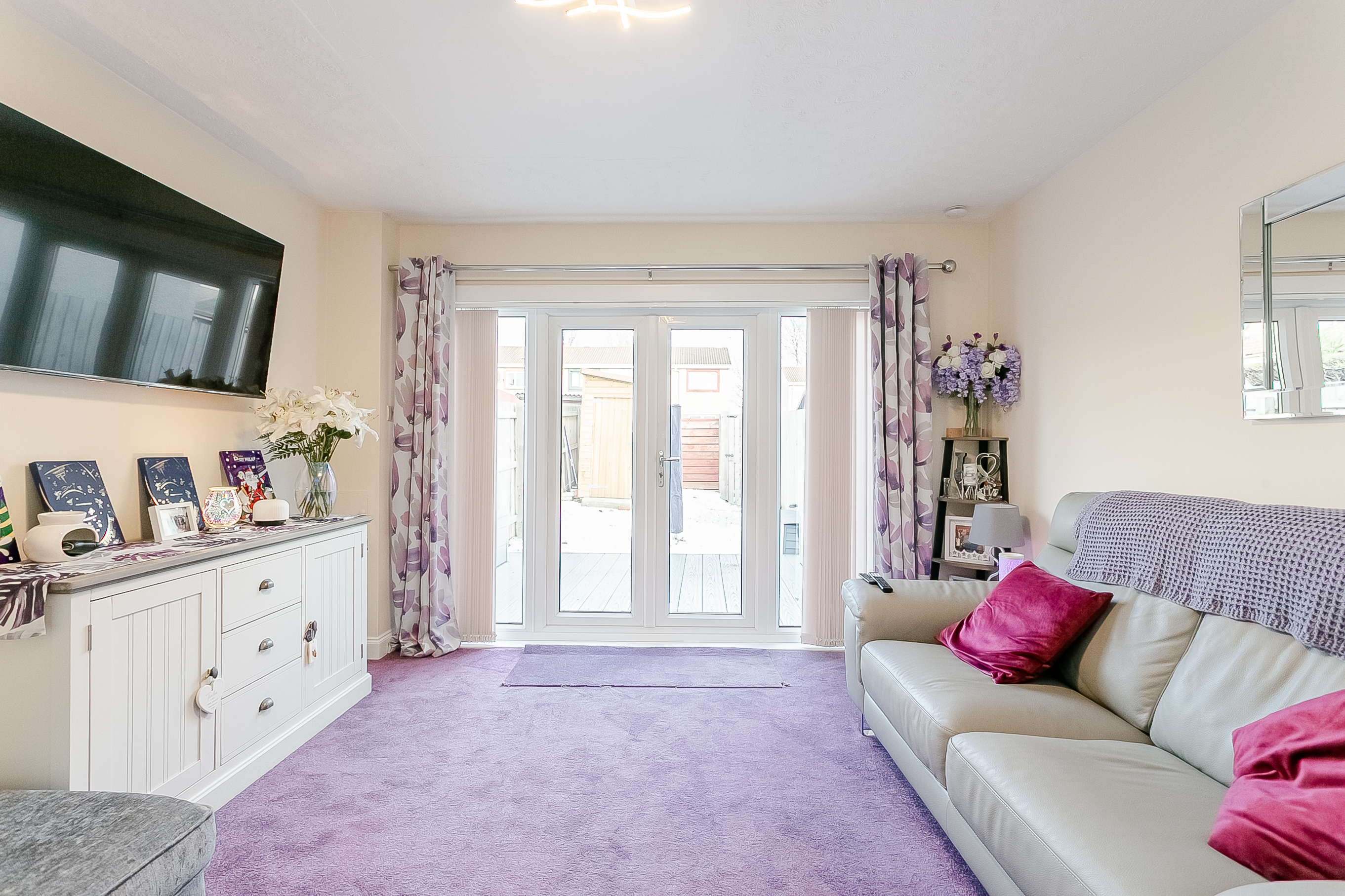 Patio doors open directly into the rear garden, bringing in plenty of natural light and creating an easy flow between indoor and outdoor space. The room also benefits from a useful built-in storage cupboard and offers ample space for both comfortable seating and a dining area if desired.