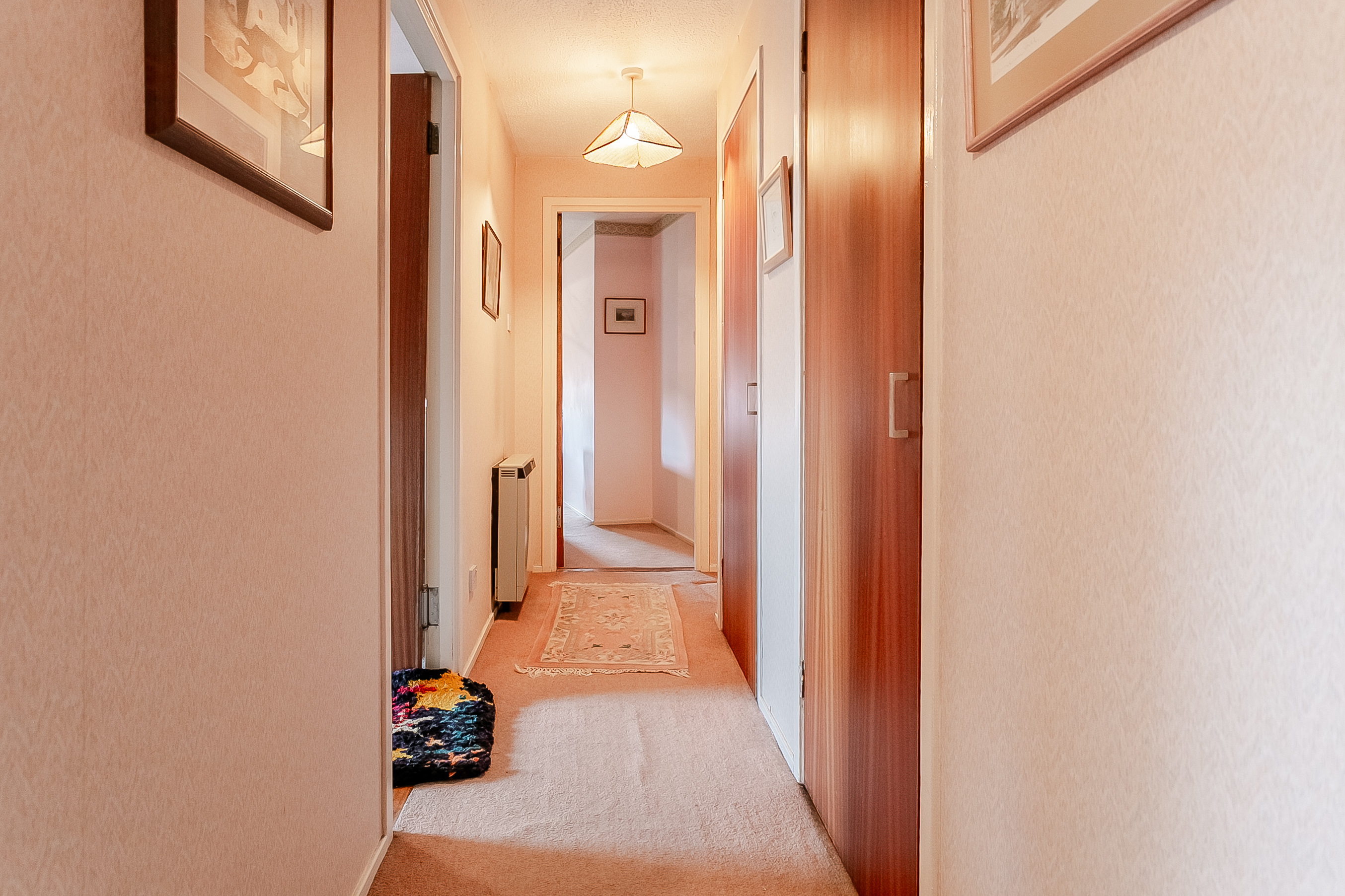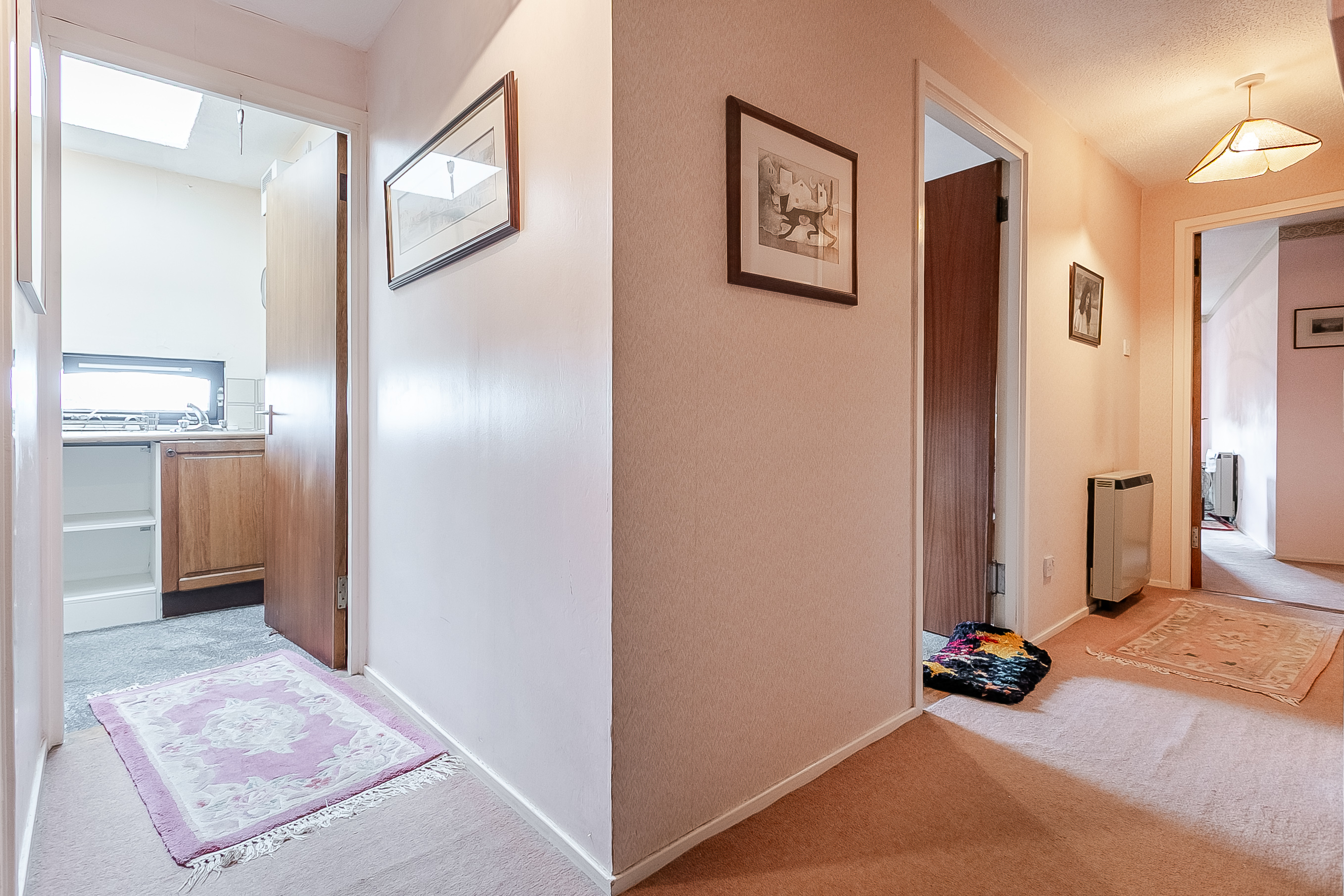 At the front of the home, the kitchen is fitted with wood-effect countertops, a tiled splashback and a sink with a drainer, as well as space for essential appliances, making it a practical and functional area. The double bedroom is well-proportioned and benefits from two windows that allow plenty of natural light to flow through, enhancing the sense of space, while the hallway also features built-in cupboards that provide valuable storage options.